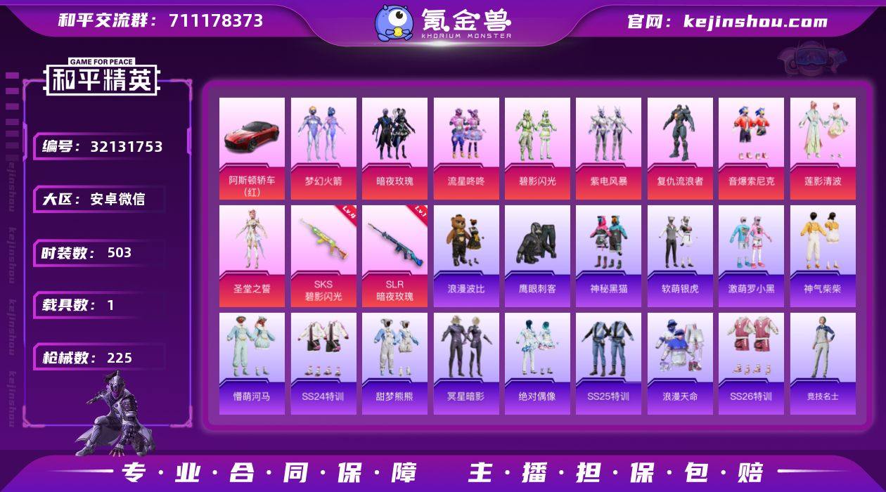 xy【67028热力值】【10王牌】【9粉装2特效枪1载具】 【热门】浪漫波比,SCAR-L-黄金龙骨,狂沙舞者,雪山精英,浪漫天命 【载具】阿斯顿·马丁DBS(红) 【粉装】梦幻火箭,圣堂之誓,莲影清波,暗夜玫瑰,音爆索尼克,复仇流浪者,紫电风暴,碧影闪光,流星咚咚 【特效枪】四级SKS-碧影闪光,一级SLR-暗夜玫瑰 【背包】恐龙拽拽背包(1级),百万伏特背包(1级),百万伏特背包(3级) 【头盔】 【优质战备】梦幻火箭降落伞,梦幻火箭飞行器,炫紫旋律降落伞,四圣焕新降落伞,暗夜玫瑰降落伞,甜心娃娃降落伞,暗星紫秘降落伞,碧影闪光降落伞,环太平洋降落伞,音爆索尼克降落伞,第五大道降落伞,星之彼岸降落伞,橘柚倾心降落伞