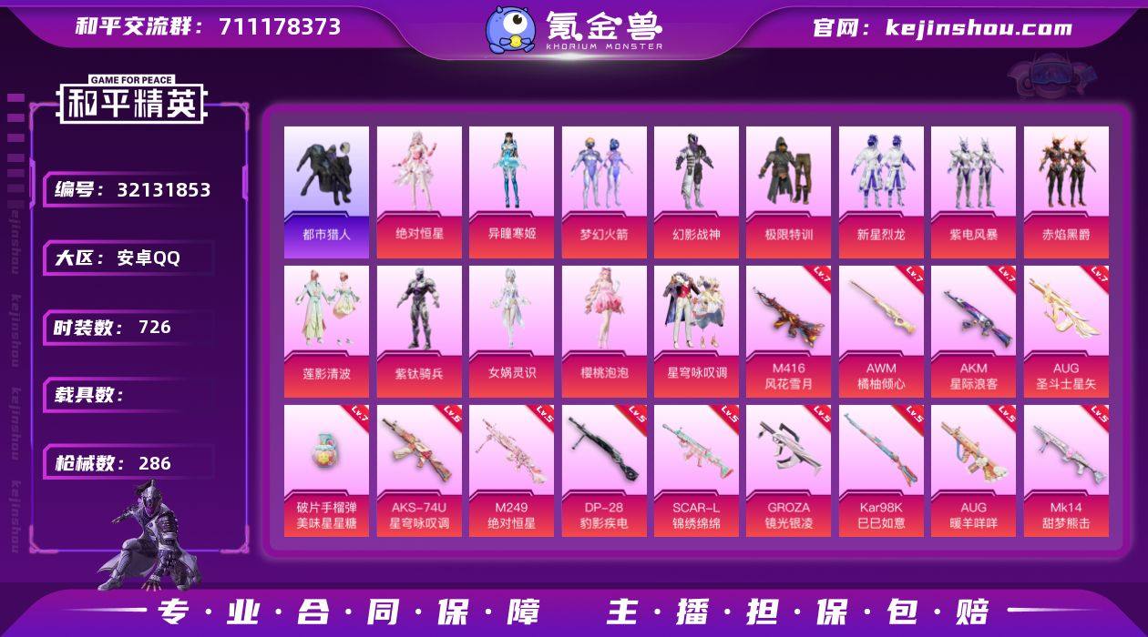 【98480热力值】【16王牌】【13粉装16特效枪】1300物资币, 【热门】都市猎人,暗影哥特,小丑鱼套装,浪漫天命 【粉装】梦幻火箭,绝对恒星,异瞳寒姬,紫钛骑兵,莲影清波,赤焰黑爵,紫电风暴,新星烈龙,幻影战神,极限特训,女娲灵识,樱桃泡泡,星穹咏叹调 【特效枪】五级M249-绝对恒星,七级破片手榴弹-美味星星糖,七级AUG-圣斗士星矢,七级AKM-星际浪客,七级AWM-橘柚倾心,七级M416-风花雪月,六级AKS-74U-星穹咏叹调,五级AUG-暖羊咩咩,五级Kar98K-巳巳如意,五级GROZA-镜光银凌,五级SCAR-L-锦绣绵绵,五级DP-28-豹影疾电 【背包】恐龙拽拽背包(3级),恐龙拽拽背包(2级),恐龙拽拽背包(1级),百万伏特背包(2级) 【头盔】 【优质战备】终晖之翼飞行器,最终圣卫者降落伞,时光之吻飞行器,时光之吻降落伞,时光之誓降落伞,幻彩电音降落伞,星穹咏叹调降落伞,晶梦幻蝶降落伞,祥瑞起舞飞行器,临安公主降落伞,江南烟雨降落伞,圣堂之誓降落伞,冷魅冰骑降落伞,梦幻火箭降落伞,暗星紫秘降落伞,垂柳戏鸭降落伞,彩虹甜喵降落伞,恐龙拽拽降落伞,橘柚倾心降落伞