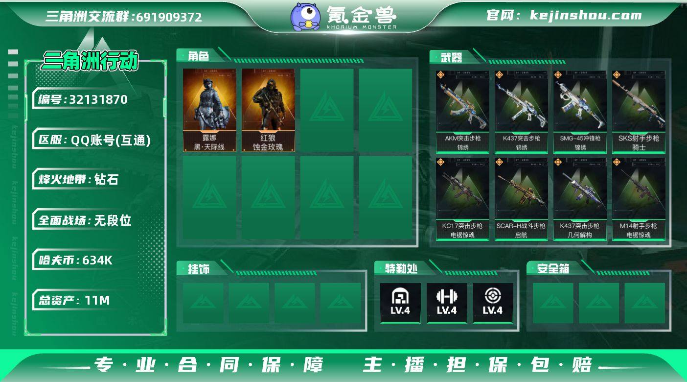 11m总资产-634k哈伏币-60烽火等级-钻石-1战场等级-无军衔 【干员外观】:红狼-蚀金玫瑰,露娜-黑·天际线 【近战皮肤】:近战-黑鹰 【传说外观】:M4A1突击步枪-蚀金玫瑰,M4A1突击步枪-阿米娅,AKM突击步枪-锦绣,AK-12突击步枪-特斯拉线圈,SCAR-H战斗步枪-启航,腾龙突击步枪-捞点薯条,K437突击步枪-几何解构,K437突击步枪-锦绣,KC17突击步枪-电锯惊魂,UZI冲锋枪-特斯拉线圈,SMG-45冲锋枪-锦绣,SR-3M紧凑突击步枪-特斯拉线圈,勇士冲锋枪-能天使-午夜邮差,M14射手步枪-电锯惊魂,SKS射手步枪-骑士,AWM狙击步枪-捞点薯条,93R-捞点薯条,复合弓-黑·天际线 【史诗外观】:K416突击步枪-暗鸦,QBZ95-1突击步枪-曙光,K416突击步枪-冬日风情,K416突击步枪-阿萨拉特攻,M16A4突击步枪-竞赛选手,AUG突击步枪-蝮蛇,G3战斗步枪-哈夫克警备,MP5冲锋枪-深海恐惧,MP5冲锋枪-战术竞备,MP5冲锋枪-竞技风,P90冲锋枪-紧急戒备,Vector冲锋枪-阿萨拉文明,Vector冲锋枪-猎鳄行动,SR-3M紧凑突击步枪-战术竞备,勇士冲锋枪-工业狂潮,MP7冲锋枪-六套之力,QJB201轻机枪-炽焰,QJB201轻机枪-Old Habits,SV-98狙击步枪-林中猎手,SV-98狙击步枪-囚徒 【稀有外观】:AK-12突击步枪-阿萨拉卫队,M700狙击步枪-阿萨拉卫队,野牛冲锋枪-黑潮,SCAR-H战斗步枪-旧梦,AKM突击步枪-肃杀,QBZ95-1突击步枪-公平竞技,K416突击步枪-一帆风顺,AUG突击步枪-指挥官,AUG突击步枪-精英联盟,M7战斗步枪-捣蛋鬼,SG552突击步枪-2026,SG552突击步枪-贴花艺术,SCAR-H战斗步枪-荣耀列队,SCAR-H战斗步枪-开心时刻,CAR-15突击步枪-前沿科技,腾龙突击步枪-前沿科技,腾龙突击步枪-冰天雪地,K437突击步枪-精英联盟,MP5冲锋枪-虎啸,MP5冲锋枪-哈夫克卫队,P90冲锋枪-黄昏,Vector冲锋枪-先锋,UZI冲锋枪-亚特兰蒂斯,SMG-45冲锋...