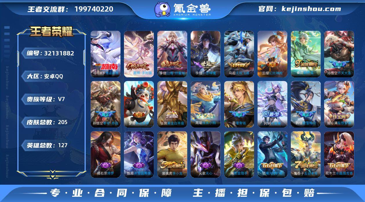 【v7小帅,205皮,1珍品10传说,马克基德,李信年限,猴子2传限皮,虞姬年限,妲己美乐蒂,10套按键,水晶238抽】贵族7 珍品传说1 传说皮肤10 史诗皮肤46 皮肤数量205 皮肤价值:123316 英雄127 至尊星耀II 总场次4983