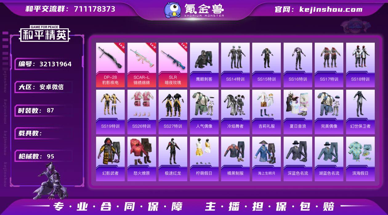 安卓 微信-0粉装-3特效枪-0载具-1粉色飞行器-26704热力值-4王牌印记-87套装-95枪皮 【粉色枪皮等级】:SCAR-L-锦绣绵绵(五级),SLR-暗夜玫瑰(五级),DP-28-豹影疾电(五级) 【粉色枪皮】:SCAR-L-锦绣绵绵,SLR-暗夜玫瑰,DP-28-豹影疾电 【粉色飞行器】:炫彩糖果飞行器 【粉色降落伞】:梦幻火箭降落伞,香水柠檬降落伞,齐天大圣降落伞,恐龙拽拽降落伞,炫彩糖果降落伞 【稀有套装】:套装-炫彩糖果 【稀有枪皮】:AKM-夜灯,AKM-彩虹符号,AKM-影袭,AKM-萌趣颜团子,AKM-虎虎生威,AKM-霓虹街区,M16A4-幻世战舞者,SCAR-L-暗夜玫瑰,SCAR-L-炫彩节奏,SCAR-L-红色方程式,M416-红色方程式,M416-蓝色火焰,GROZA-彩虹符号,GROZA-影袭,AUG-天降萌叽,QBZ-彩虹符号,QBZ-电玩视界,QBZ-飞驰魅影,M762-天降萌叽,M762-瑞龙福将,M762-绯红前夜,AC-VAL-快闪甜心,UZI-天降萌叽,UZI-影袭,UZI-炫彩节奏,UZI-红色方程式,UMP45-夜灯,UMP45-生命誓言,UMP45-蓝色火焰,Vector-彩虹符号,汤姆逊-耀粉歌者,野牛-电玩视界,P90-快闪甜心,P90-飞驰魅影,Kar98K-彩虹符号,Kar98K-炫彩节奏,Kar98K-飞驰魅影,M24-影袭,AWM-王牌四分卫,SKS-夜灯,Win94-瑞龙福将,MK20-H-快闪甜心,S686-生命誓言,S1897-飞驰魅影,S12K-瑞龙福将,S12K-幻世战舞者,DP-28-彩虹符号,MG3-幻世战舞者,MG3-瑞龙福将,沙漠之鹰-快闪甜心 【其他套装】:套装-SS14特训,套装-SS15特训,套装-SS16特训,套装-SS17特训,套装-SS18特训,套装-SS19特训,套装-SS26特训,套装-SS27特训,套装-人气偶像,套装-冷焰舞者,套装-吉莉礼服,套装-夏日音浪,套装-完美偶像,套装-幻世保卫者,套装-幻影武者,套装-怒火燎原,套装-极速红龙,套装-柠萌假日,套装-橘黑制服,套装-海上生明月,套装-深蓝色名流,套装-湖蓝色名流,套装-滨海假...