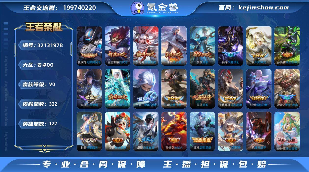 实名: 可修改 贵族等级: V0 英雄数: 127 皮肤数: 322 荣耀水晶: 武则天,无限飓风号 传说皮: 云鹰飞将,绛天战甲,猫影幻舞,久胜战神,炽阳神光,一念神魔,云霓雀翎,末日机甲-孙尚香,地狱火,零号·赤焰,飞鸢探春,胖达荣荣,淬星耀世,启明星使 限定皮: 冰锋战神,遇见飞天,李小龙,奔雷神使,祈雪灵祝,游园惊梦,梁祝,御风骁将,时雨天司,龙胆,武圣,烈魂,辉光之辰,玄嵩,白晶晶,岱宗,天魔缭乱,神威,幽恒,时之彼端,飞衡,太华,冰霜恋舞曲,天狼运算者,逐梦之星,逐梦之影,逐梦之光,神奇女侠,天狼绘梦者,凤求凰,白虎志,朱雀志,凤凰于飞,如梦令-嫦娥,至尊宝,默契交锋-兰陵王,如梦令-后羿,大圣娶亲,默契交锋-花木兰,霸王别姬-项羽,霸王别姬-虞姬,高山流水,孙行者,猪悟能,五谷丰年 亮点: 【精品号手慢无】消费任意到V9 差2满英雄 铭文多 典藏夏侯惇无限飓风号22传说