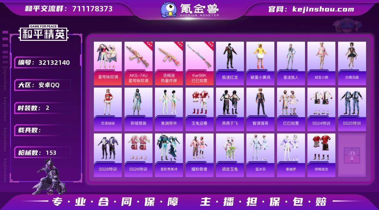 WJ772【2粉装-6特效枪素材号】安卓手Q-2粉装-6特效枪-123套装-153枪皮-5王牌印记-超级王牌5星-41588热力值【2粉装】角色-异瞳寒姬,星穹咏叹调【6特效枪】DP-28-豹影疾电[5级],AKS-74U-星穹咏叹调[7级],Mk14-甜梦熊击[5级],Kar98K-巳巳如意[5级],汤姆逊-热量炸弹[5级],MG-36-沧焰双生[5级]【8飞行器】鸡智如我飞行器,粉色滑翔尾迹,破刃行动尾迹,顶峰精英尾迹,炫彩糖果飞行器,异域银装飞行器,狂鲨锋刃飞行器,登顶巅峰飞行器【268其它衣服和枪皮】破晓战魂,破蛋小黄鸡,青年教官,缤纷果语,元气之梦,异域银装,青翼流星,SS20特训,玉兔迎春,角色-绛羽幽主,SS21特训,长空猛禽,画境星梦,完美偶像,街头潮人,人气偶像,黄色名流,柠萌假日,角色-无面战甲,漫游都市,幻世战舞者,旭日情侣,猎鹰,朱霞炽焰,狂鲨锋刃,橘黑制服,蓝冰羽,火种守卫者,街头风暴,猛禽,魅力单车,星影赞美诗,黑色伏地魔,深蓝色名流,白熊同盟,顽皮玉兔,燕燕于飞,彩虹兔,SS26特训,云朵鹅,绯格组合,元素星魂,粉黛兰香,黄色运动,耀粉歌者,青春校园,智谋强哥,SS35特训,海盐绵绵冰,白糯汤圆,湖蓝色名流,SS30特训,牛气冲天,蝶变,极速红龙,SS33特训,牛气满满,SS24特训,午间小调,SS28特训,特训学院,冰河战士,竞技达人朋克,擎苍青焰,甜蜜告白,顶瓜瓜,冷焰舞者,春日漫步,鹤鸣,恋语绒绒,书海巡游,香桃花海,海岛探路者,战术大师,黄色伏地魔,大橘大利,红色运动,炫彩糖果,紫幽梦,风迹短诗,青涩时光,角色-紫俏灵猫,白色伏地魔,SS29特训,萌鸡速递,萌趣咩咩,角色-光矢逐梦,小鸟芋圆,灼焰舞者,游乐,电音精灵,绮丽涂鸦,竞技名士,蓝彩潮人,SS31特训,龙的传人,坚韧舞者,凌霄紫焰,蓝色运动,SS25特训,天籁歌者,SS34特训,薄荷星砂,王牌教练,巳巳如意,星途旅人,都市魅力,鱼渊荷华,云魄琉璃,SS36特训,战地督导,秘语星愿,雪国风尚,酒红色名流,幻影武者,雪绒豹,琴音绮想,龙魂突击队,SS32特训