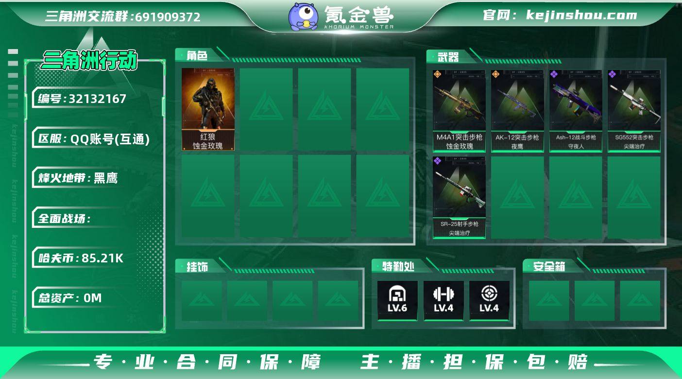 XXSJZ815【103M 蚀金玫瑰捆绑包 夜鹰捆绑包】三端互通-Q区-总资产103M-哈夫币85211K-烽火地带等级50-烽火地带段位:黑鹰 【干员皮肤】 红狼-蚀金玫瑰 夜鹰 【传说枪皮】 AK-12突击步枪-夜鹰 M4A1突击步枪-蚀金玫瑰 【史诗枪皮】 SR-25射手步枪-尖端治疗 Ash-12战斗步枪-守夜人 SG552突击步枪-尖端治疗 【刀皮】 黑鹰