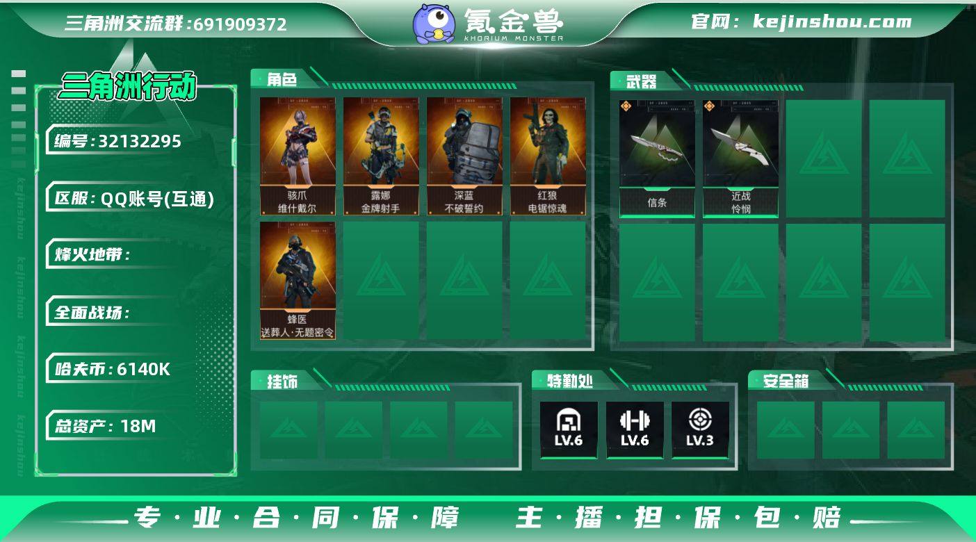 S1385 总资产18M,哈夫币614w,近战3 枪皮数量204,骇爪-维什戴尔/露娜-金牌射手/红狼-电锯惊魂/深蓝-不破誓约/蜂医-送葬人无题密令,近战-信条/近战-怜悯,战场等级20列兵, 行动等级60黑鹰,安全箱等时效性道具请以游戏内数据为准,详情请看图
