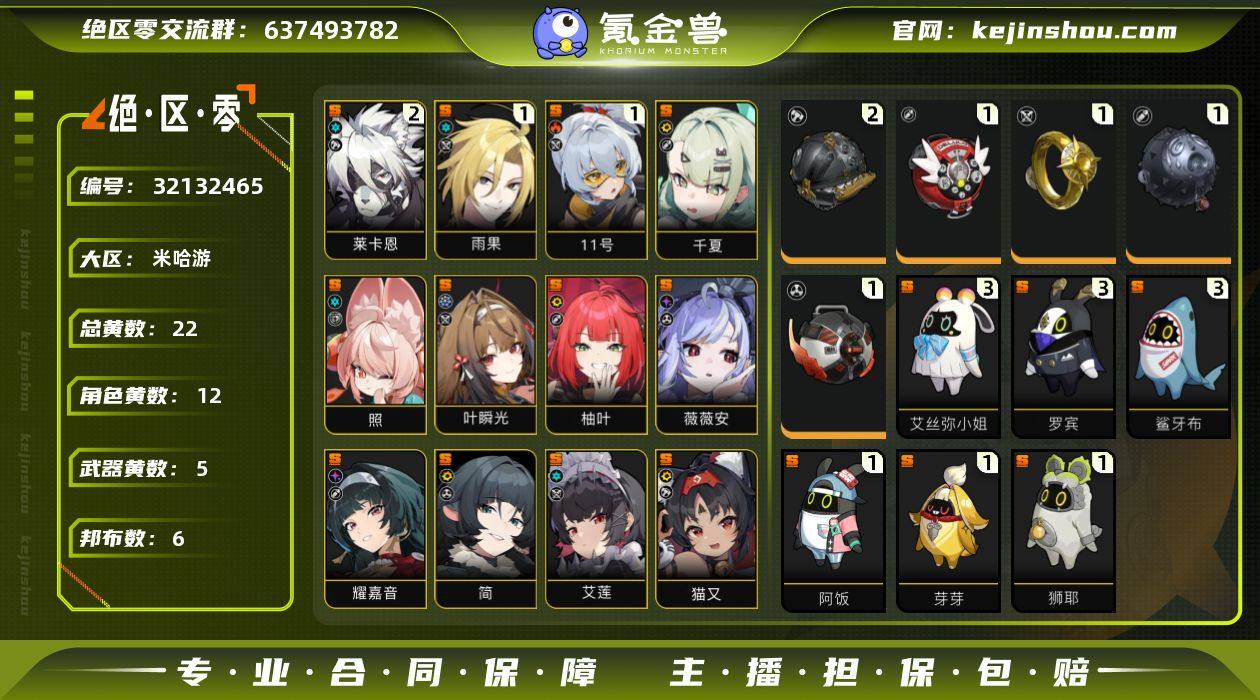 冒险等级:56 总黄数:22 五星角色数:12 菲林底片数量:7 菲林数量:498 加密母带数量:0 2命莱卡恩,1命雨果,1命「11号」,0命千夏,0命叶瞬光,0命照,0命柚叶,0命薇薇安,0命耀嘉音,0命简,0命艾莲,0命猫又 6命波可娜,6命露西,6命苍角,6命派派,6命比利,6命本,6命妮可,6命安东,6命可琳,4命潘引壶,4命赛斯,3命安比,0命真斗 2精拘缚者,1精思络成歌,1精千面日陨,1精啜泣摇篮,1精嵌合编译器 3精艾丝弥小姐,3精罗宾,3精鲨牙布,1精阿饭,1精芽芽,1精狮耶 白心旧影,晴澜双迹套装,漪光夜曲