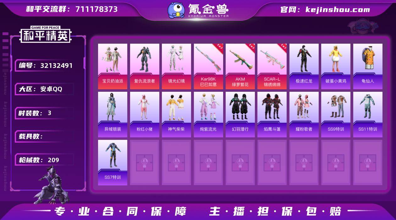 DSH2256【特价出售】安卓手Q-3粉装-4特效枪-175套装-209枪皮-4王牌印记-不朽星钻Ⅲ-62612热力值【3粉装】角色-复仇流浪者,镜光幻境,宝贝奶油派【4特效枪】Kar98K-巳巳如意[5级],AKM-绿萝繁花[5级],DP-28-豹影疾电[5级],SCAR-L-锦绣绵绵[5级]【11飞行器】顶峰精英尾迹,夜幕颂歌飞行器,繁龙极客飞行器,炫彩糖果飞行器,光之冒险尾迹,空岛之星尾迹,鸡智如我飞行器,粉色滑翔尾迹,狂鲨锋刃飞行器,花傲天飞行器,异域银装飞行器【1头盔】金风玉露头盔 【377其它衣服和枪皮】骑行爱好者,萌鸡速递,SS11特训,甜梦熊熊,白色伏地魔,荣耀,跃动心情,黑色伏地魔,惊鸿侠骨,白糯汤圆,猎梦纪元,特战装甲,青玉碎影,探宝勇士,粉黛兰香,萌趣咩咩,极速光影,北国孤狼,热血青春,军械专家,冰河战士,SS25特训,深蓝色名流,春光漫游,异域银装,福星高照,神气柴柴,猛禽,长空猛禽,野性战心,贝斯之夜,竞技达人朋克,SS28特训,SS14特训,飞行日记,空投萌叽,龟仙人,极地朋克,黄色运动,恋语绒绒,绯格组合,特训学院,蓝彩潮人,竞技勇士朋克,SS7特训,酷潮明星,SS19特训,SS5特训,黄色伏地魔,虎虎生威吉莉,破蛋小黄鸡,完美偶像,魅力单车,耀眼新星,麻辣教官,SS13特训,无暇誓言,怒火燎原,街头风暴,冰川格斗者,SS27特训,顶瓜瓜,SS8特训,粉红小猪,锦衣飞扬,黎明保卫者,幻影武者,萌趣颜团子,涂山之恋,SS31特训,焰鹰斗篷,绚紫流光,元气之梦,海岛探路者,绮丽涂鸦,青年教官,格斗先锋,特种颜团子,橘黑制服,活力之心,耀粉歌者,吉莉礼服,精神漫游,旭日情侣,玉兔迎春,龙的传人,蓝色守护者,娇憨猪猪,人气偶像,SS17特训,SS15特训,都市漫游者,灼焰舞者,冰爽风暴,音速流光,酒红色名流,虚音幻奏,甜蜜告白,SS18特训,炫蓝之夏,星途旅人,香桃花海,SS10特训,元素星魂,夏日音浪,SS29特训,大橘大利,街头潮人,SS35特训,战术大师,快闪甜心,SS26特训,炫彩糖果,牛气冲天,都市魅力,空岛之星,...