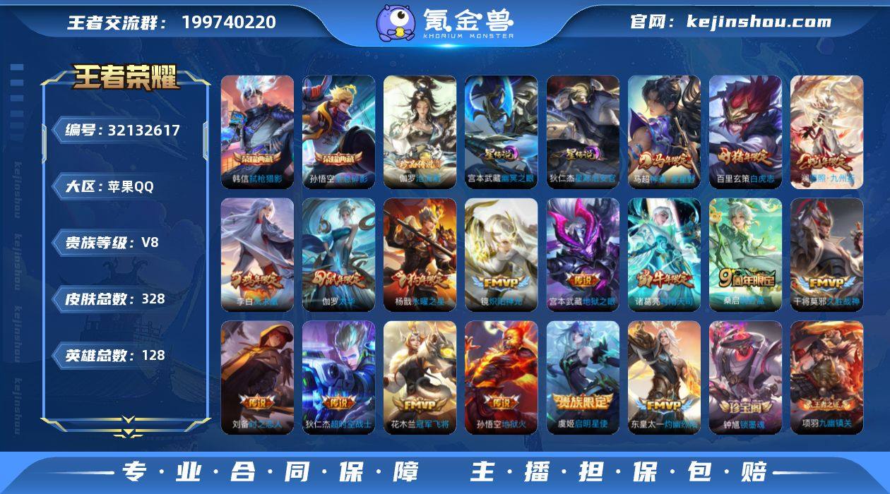 AHC30885,,,钱包实名未注销--苹果Q-V8-最强王者段位-128英雄-328皮肤-2典藏皮肤-1珍品传说-17传说-91史诗 【英雄全皮】:孙权全皮,敖隐全皮,影全皮 【荣耀典藏】:孙悟空全息碎影,韩信弑枪猎影 【珍品传说】:伽罗沧流箭 【传说皮肤】:马超神骥逐星野,澜愿照九州拓,桑启鸣野蒿,东皇太一灼幽烈阳,诸葛亮时雨天司,镜炽阳神光,虞姬启明星使,刘备时之恋人,伽罗太华,干将莫邪久胜战神,百里玄策白虎志,花木兰冠军飞将,杨戬永曜之星,李白凤求凰,宫本武藏地狱之眼,孙悟空地狱火,狄仁杰超时空战士 【限定皮肤】:姜子牙天穹之誓,李白谪仙醉月,狄仁杰阴阳师,赵云皇家上将,嬴政优雅恋人,鲁班七号狮舞东方,高渐离玩趣恶龙,阿轲迷踪丽影,钟无艳王者之锤,钟无艳超时空战士,周瑜赤莲之焰,元歌无心,夏侯惇朔风刀,甄姬落雪兰心,曹操天狼征服者,典韦蓝屏警告,马可波罗暗影游猎,狄仁杰魔术师,狄仁杰万华元夜,达摩沙漠行僧,项羽海滩派对,老夫子醍醐杖,程咬金演武夺筹,刘邦夺宝奇兵,韩信飞衡,王昭君午后时光,兰陵王驯魔猎人,兰陵王金庭之子,牛魔御旌,后羿辉光之辰,李元芳银河之约,李元芳云中旅人,虞姬启明星使,钟馗神迹守卫,钟馗驱傩正仪,杨玉环遇见飞天,杨戬永曜之星,女娲朔望之晖,雅典娜黎明之约,蔡文姬繁星吟游,鬼谷子原初探秘者,鬼谷子五谷丰年,诸葛亮时雨天司,百里玄策白虎志,百里玄策原初追逐者,弈星混沌棋,梦奇顽趣,沈梦溪星空之诺,沈梦溪大漠名商,明世隐疑决卦,裴擒虎李小龙,裴擒虎擒涛扼浪,狂铁电玩高手,云中君纤云弄巧,伽罗太华,盾山御銮,猪八戒西部大镖客,上官婉儿梁祝,嫦娥拒霜思,鲁班大师探海日志,桑启海盐诗旅,张良古海寻踪,蒙犽百解令,蒙恬荣光圣徽,鬼谷子天穹祈灯,沈梦溪龙舞盛年,刘邦剑破天穹,程咬金群星魔术团,周瑜熔金...