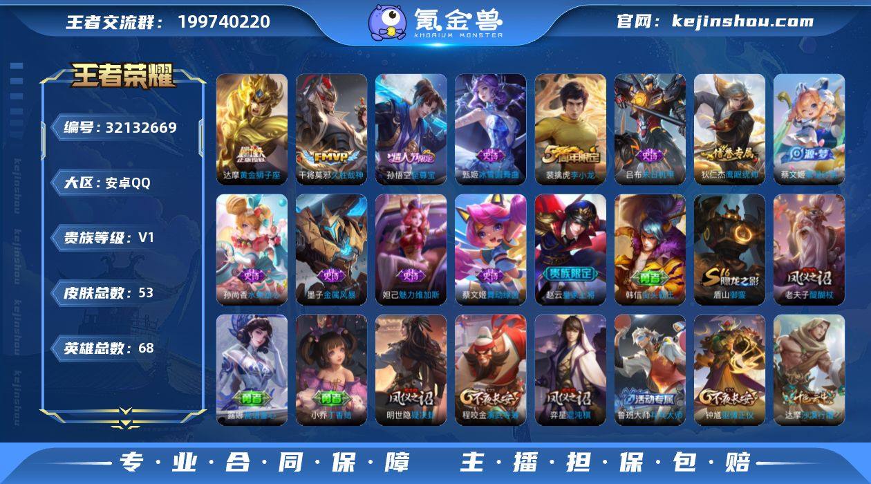安卓Q-V0-秩序白银I段位-68英雄-53皮肤-2传说-11史诗【传说皮肤】:干将莫邪久胜战神,达摩黄金狮子座【限定皮肤】:狄仁杰阴阳师,赵云皇家上将,狄仁杰万华元夜,达摩沙漠行僧,项羽海滩派对,老夫子醍醐杖,程咬金演武夺筹,兰陵王金庭之子,孙悟空至尊宝,钟馗驱傩正仪,蔡文姬繁星吟游,鬼谷子原初探秘者,弈星混沌棋,明世隐疑决卦,裴擒虎李小龙,盾山御銮【赛季限定】:盾山御銮,弈星混沌棋,明世隐疑决卦,老夫子醍醐杖,鬼谷子原初探秘者,狄仁杰万华元夜,程咬金演武夺筹,钟馗驱傩正仪,达摩沙漠行僧,兰陵王金庭之子【史诗皮肤】:裴擒虎李小龙,蔡文姬繁星吟游,狄仁杰鹰眼统帅,蔡文姬舞动绿茵,孙悟空至尊宝,吕布末日机甲,墨子金属风暴,妲己魅力维加斯,孙尚香水果甜心,甄姬冰雪圆舞曲,赵云皇家上将【其他皮肤】:兰陵王金庭之子,达摩沙漠行僧,鲁班大师乓乓大师,钟馗驱傩正仪,张良缤纷绘卷,程咬金演武夺筹,露娜瓷语鉴心,狄仁杰万华元夜,鬼谷子原初探秘者,老夫子醍醐杖,明世隐疑决卦,弈星混沌棋,盾山御銮,小乔丁香结,苏烈坚韧之力,老夫子功夫老勺,狂铁命运角斗场,宫本武藏霸王丸,狄仁杰阴阳师,宫本武藏万象初新,亚瑟死亡骑士,典韦黄金武士,白起白色死神,程咬金星际陆战队,达摩大发明家,韩信街头霸王,项羽海滩派对,蒙犽归虚梦演,盘古创世神祝,猪八戒年年有余,上官婉儿修竹墨客,盾山极冰防御线,裴擒虎街头旋风,公孙离花间舞,百里玄策威尼斯狂欢,虞姬加勒比小姐,兰陵王隐刃,刘禅英喵野望,小乔万圣前夜,鲁班七号福禄兄弟【营地ID】:529229348
