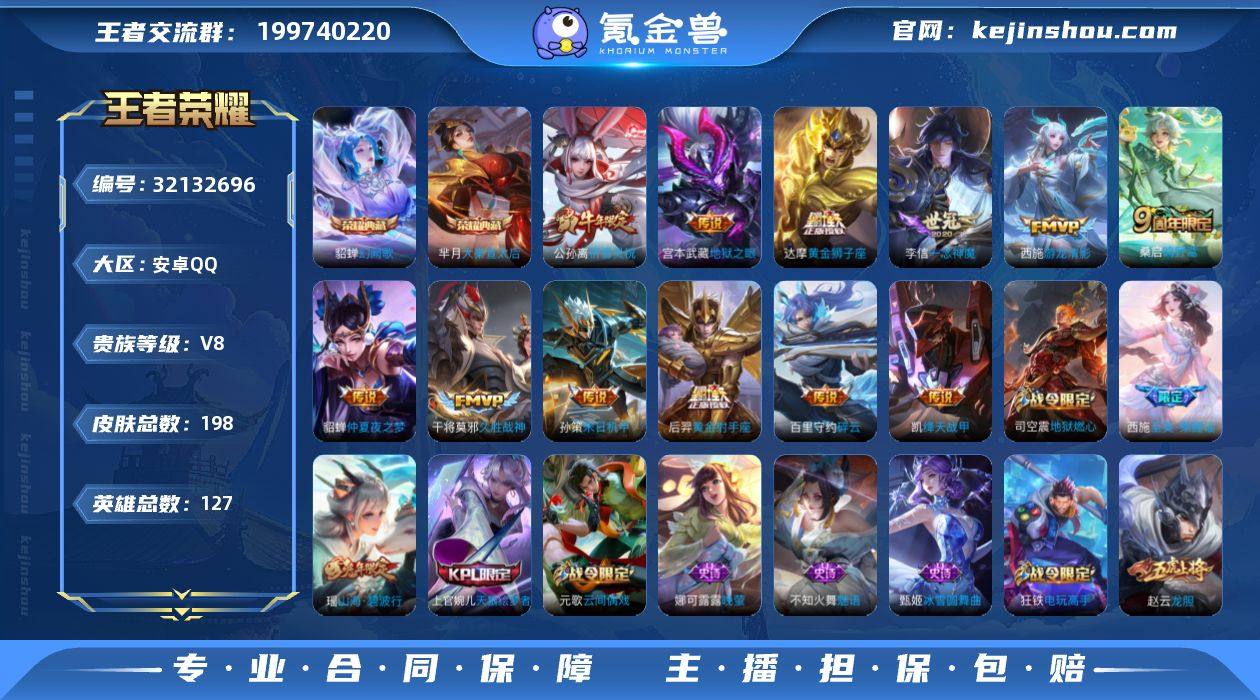 127英雄-198皮肤-安卓QQ/v8/最强王者/精选小号首选/幻阙歌 貂蝉,大秦宣太后 芈月/游龙清影 西施,仲夏夜之梦 貂蝉,地狱之眼 宫本武藏,祈雪灵祝 公孙离,黄金射手座 后羿,黄金狮子座 达摩,久胜战神 干将莫邪,末日机甲 孙策,一念神魔 李信,绛天战甲 铠,鸣野蒿 桑启,/198皮肤/127英雄/2典藏/0珍品无双/0无双/0珍品传说/13传说/55史诗/8稀有英雄 【2 典藏皮肤】幻阙歌 貂蝉,大秦宣太后 芈月, 【13 传说皮肤】启明星使 虞姬,碎云 百里守约,游龙清影 西施,仲夏夜之梦 貂蝉,地狱之眼 宫本武藏,祈雪灵祝 公孙离,黄金射手座 后羿,黄金狮子座 达摩,久胜战神 干将莫邪,末日机甲 孙策,一念神魔 李信,绛天战甲 铠,鸣野蒿 桑启, 【55 史诗皮肤】末日机甲 吕布,紫霞仙子 露娜,苍穹之光 项羽,天秀·启明 杨戬,五谷丰年 鬼谷子,鬼剑武藏 宫本武藏,星夜王子 白起,至美·乘鲤谣 西施,地狱燃心 司空震,线条小狗 周瑜,遇见飞天 杨玉环,摇滚巨星 嬴政,电玩高手 狂铁,滕王阁序 弈星,偶像歌手 王昭君,女仆咖啡 妲己,赏金猎手 澜,星界游侠 暃,晚萤 娜可露露,鹰眼统帅 狄仁杰,李小龙 裴擒虎,纤云弄巧 云中君,金属风暴 墨子,匿光侦查者 李元芳,特工魅影 百里守约,逐浪之夏 李元芳,驭风魔法 戈娅,魔术师 狄仁杰...