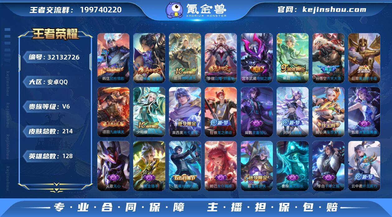 【王者荣耀】珍品无双0 典藏1 无双0 珍品传说0 传说7 史诗40 英雄128 皮肤214 贵族6级 荣耀典藏:弑枪猎影__传说皮肤:鸣野蒿|地狱之眼|黄金射手座|齐天大圣|山海·炽霜斩|神树通天|神骥·逐星野__稀有限定:蔷薇恋人|梁祝|大漠名商|古海寻踪|海滩派对|海盐诗旅|皇家上将|剑破天穹|江河有灵|魔术师|奇幻香踪|千军破阵|擒涛扼浪|燃音魔法|沙漠行僧|探海日志|天穹祈灯|妄想食味|无心|纤云弄巧|星界游侠|阴阳师|冰雪圆舞曲|德古拉伯爵|地狱岩魂|鬼剑武藏|节奏热浪|魅力维加斯|女仆咖啡|热力回旋|赏金猎手|圣诞恋歌|水果甜心|孙策-猫狗日记|天秀·启明|赵云-未来纪元|星夜王子|鹰眼统帅|幽灵船长|逐浪之夏|噬灭天穹|天穹之誓|怒海争锋|曙光守护者|千年之狐|特工魅影|谧流熔炉|化蝶舞|云中旅人|暖冬·兔眠|灵卜魔法|灵蛊蚀心|龙之律动|布丁狗之约|虚灵犬护|逆浪荇歌|黄忠-百相守梦|光弋星穹|往忆晖光|荣光之誓|巫礼祀神|鹤鸣心笺|九幽镇关|周瑜-线条小狗__优质皮肤:尼罗河女神|孤猎|木偶奇遇记|午夜歌剧院|激情绿茵|海之征途|秩序猎龙将|锦衣卫|森|超能战警|维京掠夺者|战争骑士|威尼斯狂欢|潮流仙人|芝加哥教父|街头旋风|绝影神枪|地府判官|幸存者|赤焰之缨|福禄兄弟|隐刃|前尘|特种部队|三太子|精灵王|范海辛|星航指挥官|龙域领主|占星师|魇语军师|精准探案法|圣殿之光|帝国元帅|战争女神|异域舞娘|修竹墨客|万圣前夜|动物派对|长夏之忆|异域游侠|暗都幽影|功夫炙烤|幻夜行动|聚星闪耀|潮玩探月行|瓷语鉴心|次元突破|鲨炮海盗猫|丁香结|奇妙博物学|虹云星官|守护之力|幻乐之宴|功夫老勺|命运角斗场|幻想奇妙夜|海滩丽影|阿尔法小队|兔女郎|死亡骑士|黄金武士|少女阿狸|玩偶对对碰|宫本武藏-未来纪元|忍·炎影|爱心护理|街头霸王|时空谍影|破局者|王牌新星|零食大作战|西部游侠|太极少年|乐园追猎者|牛运亨通|胡桃狂想曲|紫罗...