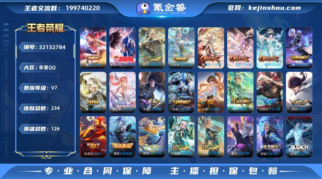 苹果Q-V7-荣耀黄金I段位-126英雄-234皮肤-1典藏皮肤-1珍品传说-16传说-64史诗【英雄全皮】:孙权全皮,空空儿全皮【荣耀典藏】:瑶拾光映像【珍品传说】:鲁班七号江户川柯南【传说皮肤】:后羿神树通天,公孙离云诺千山,妲己愿照众生和,澜愿照九州拓,虞姬愿照岁时盈,云缨幻光神枪,桑启鸣野蒿,朵莉亚心动手记,澜逐花归海,孙悟空齐天大圣,李白诗剑行,马超无双飞将,镜炽阳神光,虞姬启明星使,李信一念神魔,孙悟空地狱火【限定皮肤】:狄仁杰阴阳师,赵云皇家上将,孙尚香蔷薇恋人,高渐离玩趣恶龙,钟无艳超时空战士,元歌无心,甄姬落雪兰心,典韦岱宗,马可波罗山海玄木吟,狄仁杰魔术师,达摩沙漠行僧,项羽海滩派对,兰陵王金庭之子,孙悟空孙行者,孙悟空齐天大圣,李元芳云中旅人,虞姬启明星使,鬼谷子五谷丰年,裴擒虎李小龙,嫦娥拒霜思,嫦娥暖冬兔眠,西施玲珑珍味,鲁班大师探海日志,桑启海盐诗旅,暃星界游侠,戈娅驭风魔法,阿古朵江河有灵,张良古海寻踪,蒙犽百解令,李元芳蔬乡物语,朵莉亚心动手记【年限皮肤】:典韦岱宗,马可波罗山海玄木吟,妲己愿照众生和,澜愿照九州拓,虞姬愿照岁时盈【赛季限定】:达摩沙漠行僧,兰陵王金庭之子,李元芳云中旅人,桑启海盐诗旅,鲁班大师探海日志,张良古海寻踪,东皇太一噬灭天穹,太乙真人谧流熔炉,钟馗虚灵犬护,甄姬逆浪荇歌【战令限定】:钟无艳超时空战士,甄姬落雪兰心,暃星界游侠,嫦娥暖冬兔眠,戈娅驭风魔法,西施玲珑珍味,李元芳蔬乡物语,亚连破空之剑,孙悟空神迹守卫,百里守约百相守梦,老夫子百相守梦,孙膑茶境仙,马超访茗客,刘禅鸭鸭历险记,沈梦溪鸭鸭历险记,周瑜百相守梦,孙策百相守梦,周瑜线条小狗【史诗皮肤】:周瑜线条小狗,少司缘巫礼祀神,女娲万灵启世,黄忠百相守梦,周瑜百相守梦,后羿石田雨龙,狂...