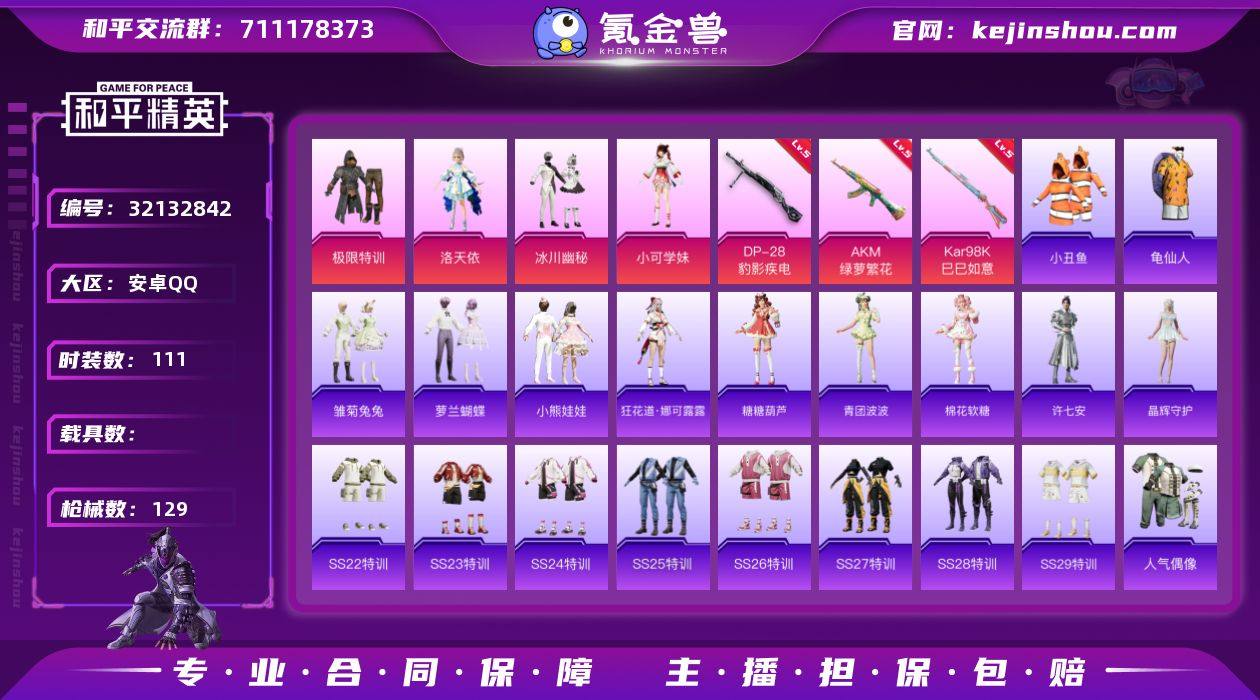 YZJ10921-可二次-安卓Q-1稀有4粉装3特效枪4热门111套装129枪皮 36656热力值 3印记 精品女身法号 洛天依 小可学妹 极限特训 娜可露露 蕾丝眼罩 软羊咩咩 小丑鱼 棉花软糖 破蛋小黄鸡 历史超级王牌4星 【1稀有】 AKM-缤纷海域 【4粉装】 洛天依 小可学妹 极限特训 冰川幽秘 【3特效枪】 AKM-绿萝繁花 (5级) Kar98K-巳巳如意 (5级) DP-28-豹影疾电 (5级) 【4热门】 小丑鱼 龟仙人 破蛋小黄鸡 极速红龙 【1头盔】 深海小丑鱼头盔 营地ID:940178003