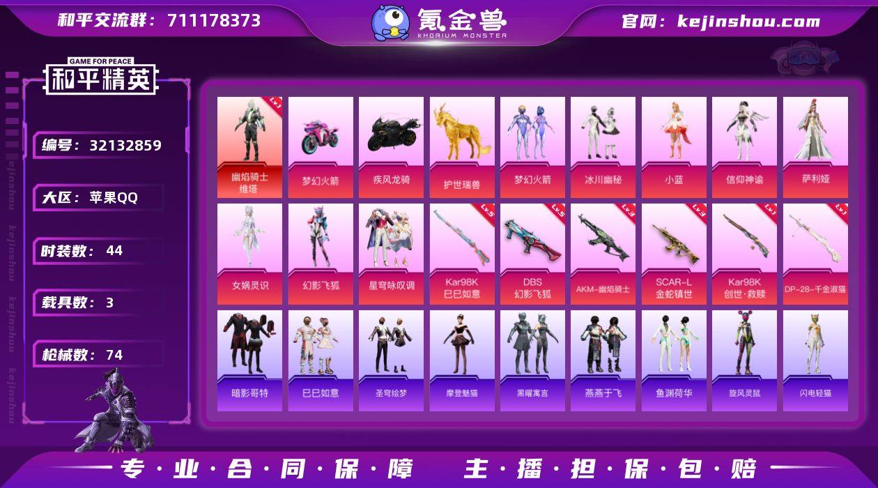 【Hhp68】苹果Q区 可改实名--【1神装 3载具 6特效枪 9粉装 44套装 74枪皮】-优质装备:幽焰骑士-维塔(一级),粉装-梦幻火箭,粉装-冰川幽秘,角色-小蓝,角色-信仰神谕,角色-萨利娅,角色-女娲灵识,粉装-幻影飞狐,粉装-星穹咏叹调,双人摩托-梦幻火箭,疾风龙骑,护世瑞兽,AKM-幽焰骑士(三级),SCAR-L-金蛇镇世(三级) 【红色神装等级】:幽焰骑士-维塔(一级) 【红色角色神装】:幽焰骑士-维塔 【热门品类】:粉装-梦幻火箭,套装-暗影哥特 【粉色套装】:粉装-梦幻火箭,粉装-冰川幽秘,角色-小蓝,角色-信仰神谕,角色-萨利娅,角色-女娲灵识,粉装-幻影飞狐,粉装-星穹咏叹调 【粉色枪皮等级】:AKM-幽焰骑士(三级),SCAR-L-金蛇镇世(三级),Kar98K-创世·救赎(一级),Kar98K-巳巳如意(五级),DBS-幻影飞狐(五级),DP-28-千金淑猫(一级) 【粉色载具】:双人摩托-梦幻火箭,疾风龙骑,护世瑞兽 【粉色枪皮】:AKM-幽焰骑士,SCAR-L-金蛇镇世,Kar98K-创世·救赎,Kar98K-巳巳如意,DBS-幻影飞狐,DP-28-千金淑猫 【粉色飞行器】:酣梦熊熊飞行器,巴啦啦小魔仙飞行器,龙翔九天飞行器,幽焰列车飞行器,万象金身飞行器 【粉色降落伞】:梦幻火箭降落伞,天星战神降落伞,精灵梦叶罗丽降落伞,墨龙九天降落伞,创世·救赎降落伞,幽焰骑士降落伞,千金淑猫降落伞,金蛇镇世降落伞,幻影飞狐降落伞,彩虹独角兽降落伞 【稀有套装】:套装-巳巳如意,套装-圣穹绘梦,角色-摩登魅猫,套装-黑曜寓言,套装-燕燕于飞,套装-鱼渊荷华,套装-旋风灵鼠,套装-闪电轻猫,套装-霓虹热舞,套装-雪绒豹 【稀有枪皮】:AKM-破晓战魂,M16A4-千金淑猫,SCAR-L-炫彩节奏,GROZA-懵萌河马,AUG-金蛇镇世,M762-天星战神,M762-天降萌叽,M762-云朵鹅,M762-幻影飞狐,AC-VAL-天降萌叽,Famas-月下星之子,Famas-墨龙九天,UZI-天...