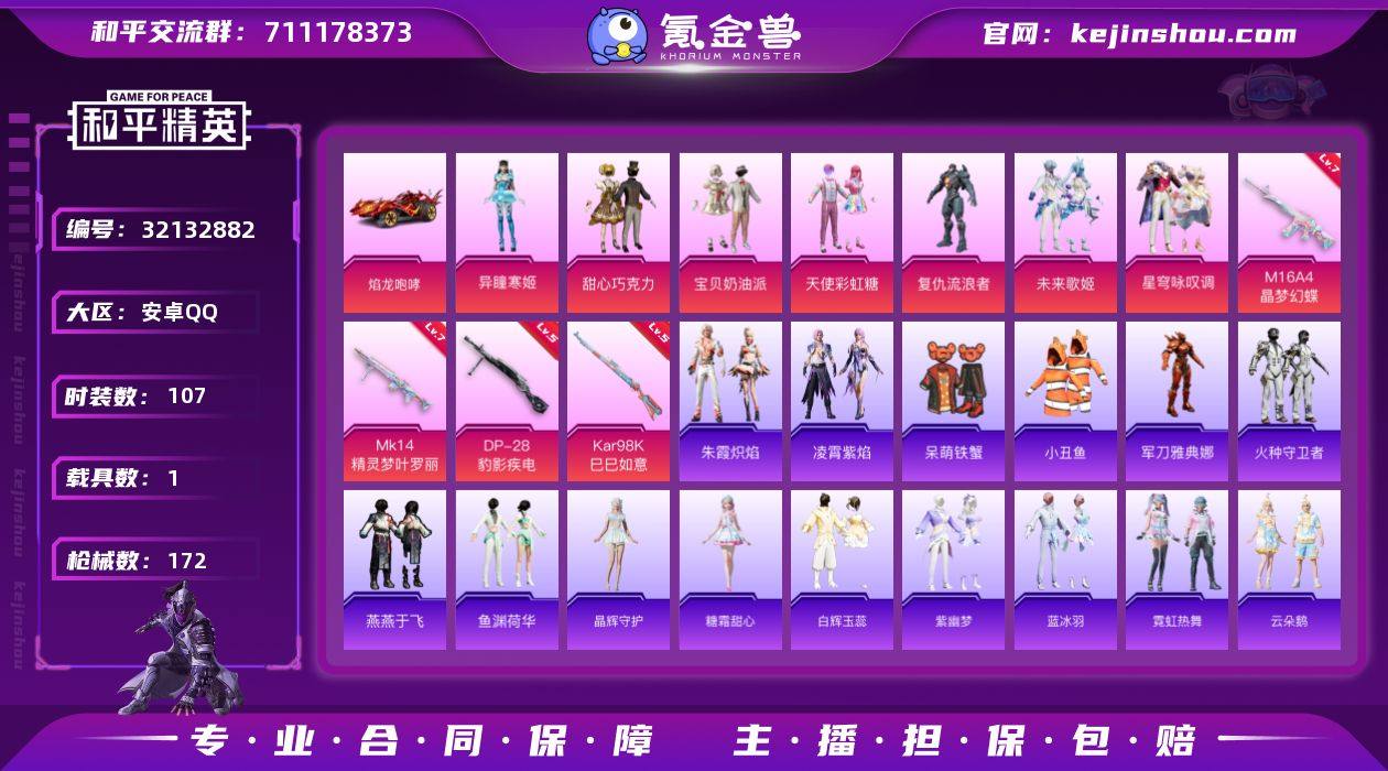 YZJ11750-可二次-安卓Q-1载具7粉装4特效枪9热门107套装172枪皮 49611热力值 9印记 历史超级王牌15星 精品公主号 巧克力三姐妹 未来歌姬 4满级常用不重复特效抢 蕾丝眼罩 破蛋小黄鸡 小丑鱼 白辉玉蕊 【1载具】 焰龙咆哮 【7粉装】 宝贝奶油派 天使彩虹糖 甜心巧克力 异瞳寒姬 未来歌姬 星穹咏叹调 复仇流浪者 【4特效枪】 Kar98K-巳巳如意 (5级) DP-28-豹影疾电 (5级) Mk14-精灵梦叶罗丽 (7级) M16A4-晶梦幻蝶 (7级) 【9热门】 小丑鱼 晶辉守护 呆萌铁蟹 破蛋小黄鸡 军刀雅典娜 英勇保护者 M762-奇异狩猎者 M24-奇异狩猎者 S686-奇异狩猎者 【1头盔】 甜心宝贝头盔 【2背包】 甜心宝贝背包 放客神游背包 营地ID:778220113
