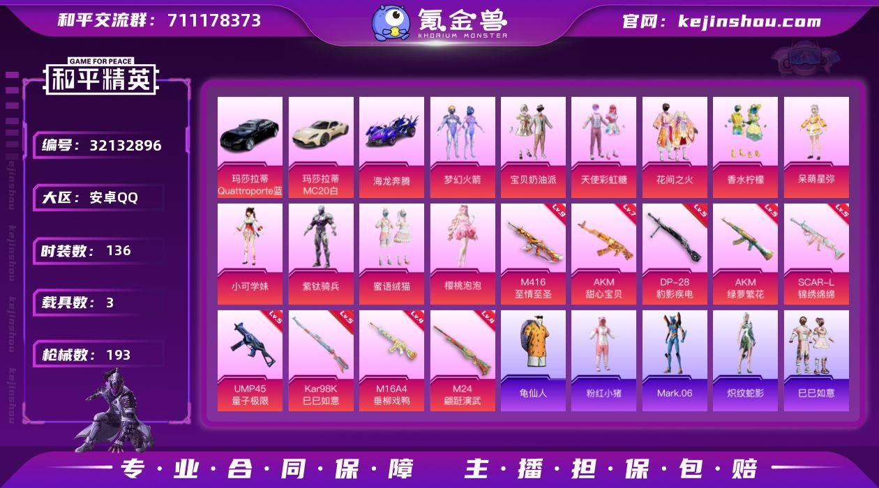 YZJ11875 可二次 安卓Q-【精品枪械素材女号 满级至情至圣 满级AK甜心宝贝 新火箭少女 和服 樱桃 呆萌 巧克力两姐妹 蜜语绒猫 香水柠檬 蓝螳螂 都市丽猫 焰鹰斗篷 贝斯之夜 棉花软糖 糖糖葫芦 】3载具11粉装9特效枪4热门136套装193枪皮 67692热力值 8印记 历史绝世王牌18星 【3载具】 玛莎拉蒂M白色 玛莎拉蒂Q蓝色 海龙奔腾 【11粉装】 梦幻火箭 时空协奏·火花 蜜语绒猫 宝贝奶油派 天使彩虹糖 樱桃泡泡 呆萌星弥 小可学妹 紫钛骑兵 花间之火 香水柠檬 【9特效枪】 SCAR-L-锦绣绵绵 (5级) AKM-甜心宝贝 (7级) AKM-绿萝繁花 (5级) Kar98K-巳巳如意 (5级) DP-28-豹影疾电 (5级) UMP45-量子极限 (5级) M416-至情至圣 (9级) M16A4-垂柳戏鸭 (4级) M24-翩跹演武 (4级) 【4热门】 Mark.06 龟仙人 纯白誓言 粉红小猪 【3飞行器】 梦幻火箭飞行器 萌物绒绒飞行器 星夜魔法师飞行翼 【3头盔】 梦幻火箭头盔 甜心宝贝头盔 甜蜜誓约头盔 【3背包】 梦幻火箭背包 甜心宝贝背包 甜蜜誓约背包 营地ID:790537473