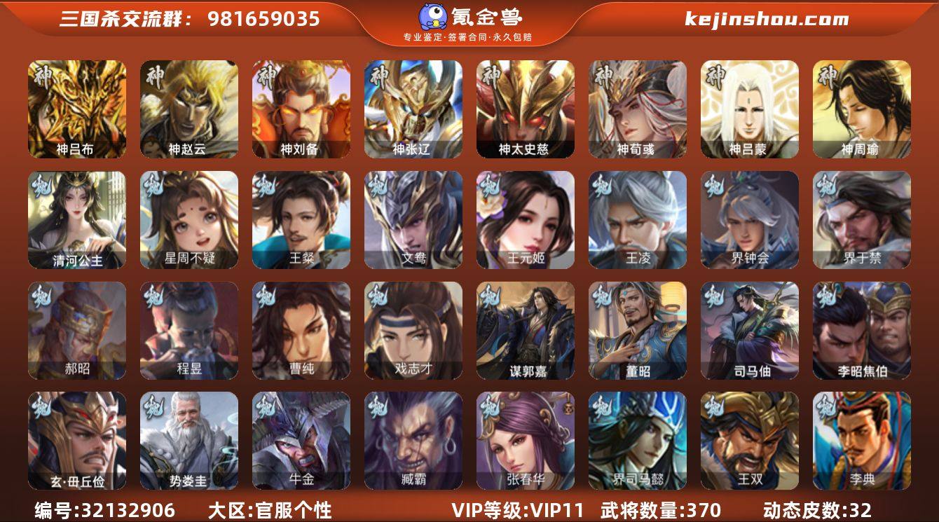 【3909】官阶:大将军;VIP等级:VIP11;史诗武将数量:48;动态皮肤数量:32;武将总数:370;史诗宝珠数量:0;将魂数量:749;神将:6;魏国史诗武将:14;蜀国史诗武将:10;吴国史诗武将:6;群史诗武将:17 神吕布,神赵云,神刘备,神张辽,神太史慈,神荀彧,星周不疑,王粲,王元姬,王凌,界钟会,界于禁,郝昭,曹纯,戏志才,清河公主,程昱,谋诸葛亮,马云騄,谋黄忠,谋赵云,谋马超,诸葛瞻,沙摩柯,谯周,界黄忠,花鬘,骆统,留赞,界徐盛,界步练师,文鸯,十常侍,裴秀,左慈,星黄忠,麹义,庞德公,南华老仙,祢衡,沮授,界左慈,界李儒,谋张角,许攸,星董卓,兀突骨,司马昭,神吕蒙,神周瑜,SP关羽,SP蔡文姬,乐进,曹昂,诸葛诞,朱灵,文聘,SP姜维,张春华,钟会,曹冲,郭淮,满宠,界王异,界曹操,界司马懿,界夏侯惇,界张辽,界许褚,李典,曹真,韩浩史涣,陈群,曹叡,曹休,钟繇,司马朗,王基,郭皇后,辛宪英,吕虔,鲁芝,蒯越蒯良,界荀彧,界徐晃,杜畿,界曹丕,界邓艾,张恭,贾逵,界曹植,界满宠,界郭淮,卞夫人,华歆,蔡贞姬,袁涣,王双,崔琰,毛玠,杨阜,阮慧,曹嵩,谋于禁,谋甄姬,界曹休,牵招,玄毌丘俭,李昭焦伯,司马孚,司马伷,谋郭嘉,牛金,界夏侯渊,臧霸,唐咨,董昭,SP孙尚香,夏侯霸,马良,关兴张苞,廖化,界马岱,关平,简雍,刘封,界法正,界关兴张苞,界刘备,界关羽,界张飞,界赵云,SP徐庶,吴懿,周仓,张松,刘谌,糜竺,马忠,孙乾,李严,黄皓,吴苋,秦宓,界黄月英,界诸葛亮,赵统赵广,界伊籍,界卧龙诸葛,界庞统,陈到,界刘禅,杨仪,邓芝,傅肜,陈震,糜夫人,王甫赵累,界周仓,宗预,刘巴,彭羕,谋庞统,界张嶷,李遗,霍峻,诸葛果,蒋琬费祎,糜芳傅士仁,甘夫人,鲁肃,孙茹,凌操,大乔小乔,诸葛恪,诸葛瑾,孙鲁育,程普,韩当,潘璋马忠,虞翻,朱然,界周泰,界甘宁,界吕蒙,界黄盖,界周瑜,界大乔,界陆逊,孙鲁班,朱桓,顾雍,孙休,全琮,阚泽,孙登,徐氏,薛综,界孙权,界孙尚香,孙亮,严畯,周鲂,界孙策,界张昭张纮,...