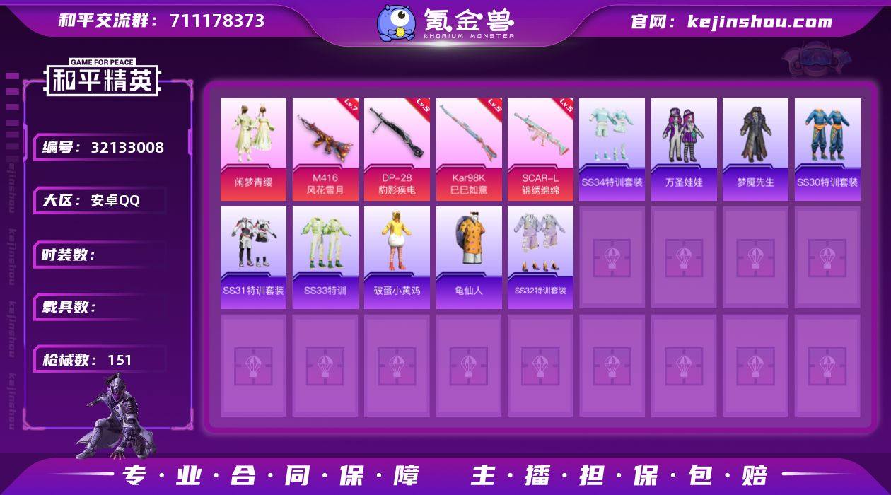 【ky77】苹果 手Q-1粉装-8特效枪-0载具-1粉色飞行器-33410热力值-8王牌印记-80套装-114枪皮 【热门品类】:套装-奇异狩猎者,套装-胖达圆圆,套装-粉红小猪,熔岩游骑兵连帽夹克 【粉色套装】:粉装-幻彩电音 【粉色枪皮等级】:AKM-绿萝繁花(五级),M416-电玩时刻(五级),AUG-暖羊咩咩(五级),M762-鬼刀(七级),UMP45-量子极限(五级),AKS-74U-森灵之息(五级),Kar98K-巳巳如意(五级),DP-28-豹影疾电(五级) 【粉色枪皮】:AKM-绿萝繁花,M416-电玩时刻,AUG-暖羊咩咩,M762-鬼刀,UMP45-量子极限,AKS-74U-森灵之息,Kar98K-巳巳如意,DP-28-豹影疾电 【粉色降落伞】:极限特训降落伞,幻影战神降落伞,闲梦青缨降落伞,精灵梦叶罗丽降落伞,月影灵韵降落伞,异瞳寒姬降落伞,炫彩糖果降落伞 【稀有套装】:套装-巳巳如意,套装-雪国风尚,套装-炫彩糖果,套装-燕燕于飞,套装-鱼渊荷华,套装-云朵鹅,套装-雪绒豹,角色-乐音,套装-朱霞炽焰,套装-凌霄紫焰,角色-紫俏灵猫 【稀有枪皮】:AKM-影袭,AKM-龙的传人,M16A4-幻世战舞者,SCAR-L-夜灯,SCAR-L-炫彩节奏,M416-糯团青竹,M416-蓝色火焰,GROZA-2B战斗服款,GROZA-影袭,AUG-天降萌叽,AUG-甜蜜菠萝,QBZ-彩虹符号,QBZ-相思残雪,M762-天降萌叽,M762-云朵鹅,AC-VAL-天降萌叽,AC-VAL-闲梦青缨,蜜獾-天降萌叽,ARX-凌霄紫焰,UZI-天降萌叽,UZI-幻影战神,UZI-影袭,UMP45-夜灯,Vector-焰鹰斗篷,汤姆逊-天降萌叽,AKS-74U-鬼刀,JS9-凌霄紫焰,P90-巳巳如意,M24-影袭,AWM-焰鹰斗篷,SKS-炫彩节奏,Mini14-炫彩节奏,M417-惊鸿侠骨,M200-惊鸿侠骨,SVD-云朵鹅,S686-巳巳如意,S1897-炫彩节奏,S12K-夜灯,DBS-焰鹰斗篷,SPAS-12-云朵鹅,M249-彩虹符号,DP-28-焰鹰斗篷,MG3-幻世战舞者,MG3-惊鸿侠骨,MG-36-凌霄紫焰,P92-凌霄紫焰,沙漠之...