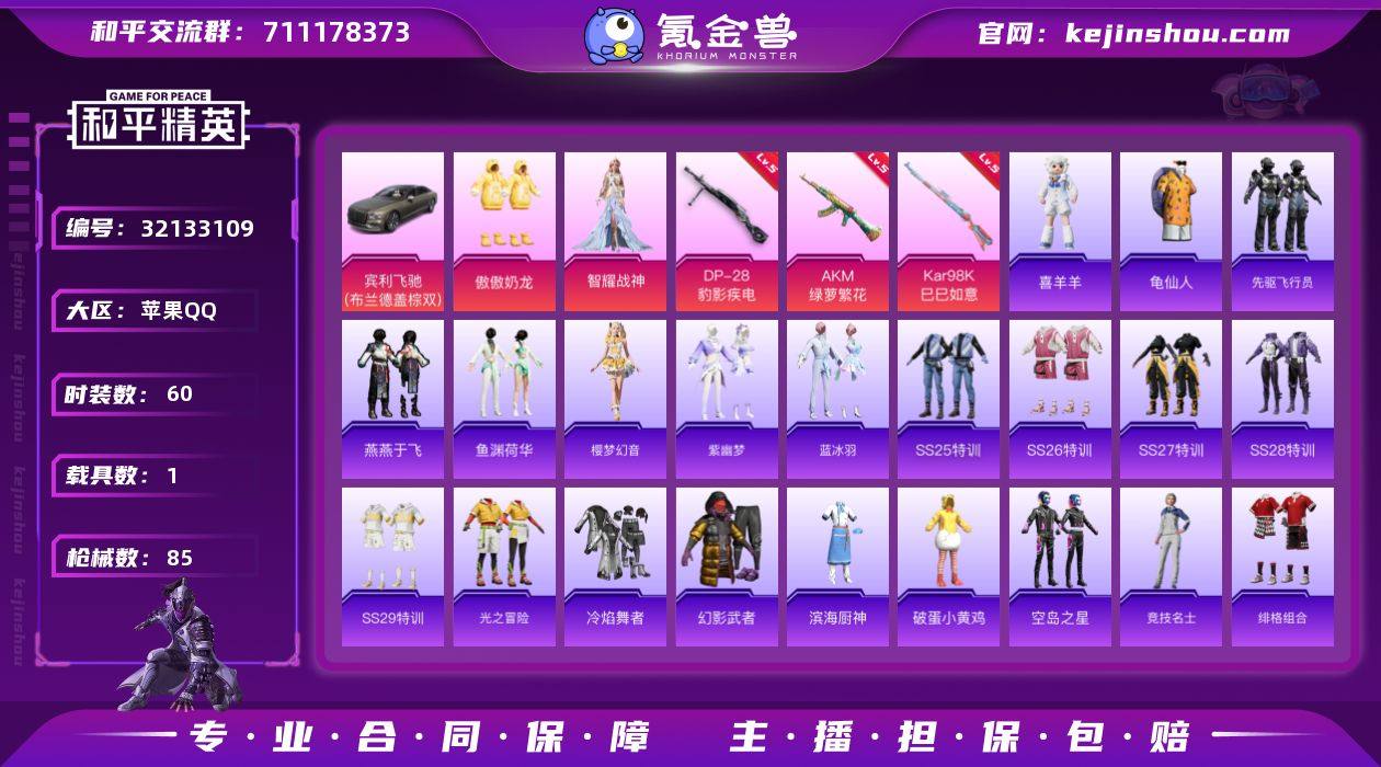 苹果 手Q-2粉装-3特效枪-1载具-1粉色飞行器-24908热力值-3王牌印记-60套装-85枪皮 【热门品类】:套装-龟仙人 【粉色套装】:粉装-傲傲奶龙,角色-智耀战神 【粉色枪皮等级】:AKM-绿萝繁花(五级),Kar98K-巳巳如意(五级),DP-28-豹影疾电(五级) 【粉色载具】:宾利飞驰(布罗德盖棕双色) 【粉色枪皮】:AKM-绿萝繁花,Kar98K-巳巳如意,DP-28-豹影疾电 【粉色飞行器】:炫彩糖果飞行器 【粉色降落伞】:极限特训降落伞,环太平洋降落伞,闲梦青缨降落伞,创世·救赎降落伞,炫彩糖果降落伞 【稀有套装】:套装-龟仙人,套装-炫彩糖果,套装-先驱飞行员,套装-燕燕于飞,套装-鱼渊荷华,套装-樱梦幻音,套装-紫幽梦,套装-蓝冰羽,玩偶服-喜羊羊 【稀有枪皮】:AKM-龙的传人,M16A4-莲影清波,SCAR-L-炫彩节奏,M416-糯团青竹,M416-蓝色火焰,M762-天降萌叽,M762-牛气冲天,AC-VAL-快闪甜心,蜜獾-天降萌叽,UZI-啾咪啾咪,UZI-天降萌叽,Vector-生命誓言,汤姆逊-天降萌叽,汤姆逊-环太平洋,汤姆逊-智耀战神,P90-快闪甜心,Kar98K-彩虹符号,Kar98K-星穹咏叹调,AWM-圣堂之誓,SKS-心之恋语,SKS-炫彩节奏,M417-惊鸿侠骨,MK20-H-快闪甜心,MK20-H-樱桃泡泡,M200-惊鸿侠骨,S12K-玩趣呆呆,M249-彩虹符号,DP-28-彩虹符号,MG3-幻世战舞者,MG3-惊鸿侠骨,P18C-镜光幻境,沙漠之鹰-快闪甜心,爆炸猎弓-惊鸿侠骨 【其他套装】:套装-SS25特训,套装-SS26特训,套装-SS27特训,套装-SS28特训,套装-SS29特训,套装-光之冒险,套装-冷焰舞者,套装-幻影武者,套装-滨海厨神,套装-破蛋小黄鸡,套装-空岛之星,套装-竞技名士,套装-绯格组合,套装-血色贵族,套装-长空猛禽,套装-雨林探路者,套装-霓虹街区,套装-霓虹闪烁,套装-魅力单车,套装-黄色名流,套装-黑色伏地魔,套装-龙的传人,套装-龟仙人,套装...