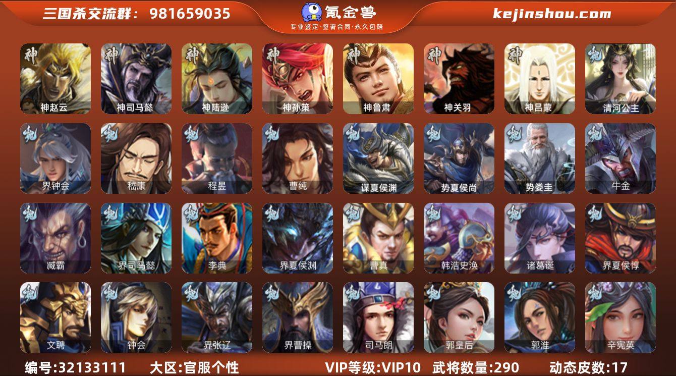 【3918】官阶:骠骑将军;VIP等级:VIP10;史诗武将数量:23;动态皮肤数量:17;武将总数:290;史诗宝珠数量:0;将魂数量:2015;神将:5;魏国史诗武将:8;蜀国史诗武将:5;吴国史诗武将:3;群史诗武将:6 神赵云,神司马懿,神陆逊,神孙策,神鲁肃,界钟会,嵇康,曹纯,清河公主,程昱,沙摩柯,谯周,傅佥,界黄忠,花鬘,周处,贺齐,势太史慈,南华老仙,沮授,界左慈,兀突骨,司马昭,神吕蒙,神关羽,势夏侯尚,SP关羽,SP蔡文姬,乐进,曹昂,诸葛诞,朱灵,文聘,SP姜维,钟会,曹冲,郭淮,满宠,界王异,界曹操,界司马懿,界夏侯惇,界张辽,界许褚,界郭嘉,李典,曹真,韩浩史涣,陈群,曹叡,曹休,钟繇,司马朗,郭皇后,辛宪英,吕虔,鲁芝,蒯越蒯良,界荀彧,界曹丕,张恭,界曹植,界满宠,辛毗,界陈群,华歆,蔡贞姬,袁涣,崔琰,谋甄姬,谋夏侯渊,牛金,界夏侯渊,臧霸,SP孙尚香,关银屏,夏侯霸,马良,关兴张苞,廖化,界马岱,关平,简雍,刘封,界关兴张苞,界刘备,界赵云,界马超,SP徐庶,吴懿,周仓,张松,刘谌,夏侯氏,糜竺,李严,黄皓,界诸葛亮,界庞统,胡金定,吕凯,张翼,杨仪,邓芝,傅肜,糜夫人,彭羕,谋庞统,谋黄月英,界张嶷,谋张飞,霍峻,诸葛果,蒋琬费祎,甘夫人,势孙韶,吴珂,凌操,大乔小乔,诸葛恪,诸葛瑾,孙鲁育,程普,韩当,潘璋马忠,虞翻,朱然,界周泰,界甘宁,界吕蒙,界黄盖,界周瑜,界大乔,界陆逊,孙鲁班,朱桓,顾雍,朱治,全琮,界孙权,界孙尚香,潘濬,吕岱,界张昭张纮,许贡,卫温诸葛直,界吴国太,孙邵,桥公,张温,陈武董袭,孙翊,界顾雍,界孙鲁班,谋周瑜,界全琮,界朱治,谋小乔,张布,谋诸葛瑾,界小乔,友徐庶,友庞统,伏完,刘协,界袁术,SP赵云,张宝,伏皇后,李儒,界张角,华雄,袁术,界华佗,界吕布,公孙瓒,蔡夫人,公孙渊,张鲁,蹋顿,SP黄月英,董白,刘虞,界貂蝉,卢植,刘繇,界高顺,界刘表,星张郃,界公孙瓒,韩遂,界伏皇后,荀谌,谋刘赪,王濬,谋卢植,阎象,鲍信,木鹿大王,杨弘,何进,势娄圭,乐就,神...