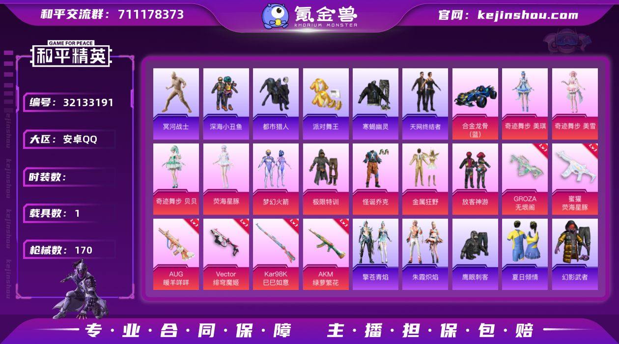 都市 寒蝎 金鞋 新101 怪诞 放客 满地铁天赋】c22773-【无二次】【因赛季更新游戏段付以上号为准!】 安卓Q-7稀有1载具9粉装9特效枪8热门132套装170枪皮 5印记 历史卓越王牌10星 【7稀有】 木乃伊 寒蝎幽灵 都市猎人 浪漫天命 派对舞王 天网终结者 派对舞王(金靴子) 【1载具】 合金龙骨蓝色 【9粉装】 梦幻火箭 奇迹舞步美雪 奇迹舞步贝贝 奇迹舞步美琪 荧海星豚 怪诞乔克 金属狂野 放客神游 极限特训 【9特效枪】 SCAR-L-魔童闹海哪吒 (3级) GROZA-无垠阁 (3级) AKM-绿萝繁花 (5级) Kar98K-巳巳如意 (5级) Vector-绯穹魔姬 (5级) MG-36-沧焰双生 (5级) DP-28-豹影疾电 (5级) AUG-暖羊咩咩 (5级) 蜜獾-荧海星豚 (7级) 【8热门】 龟仙人 鹰眼刺客 深海小丑鱼 JDE战队服 粉红小猪 水银刺客 漫步者 破蛋小黄鸡 【1飞行器】 齐天大圣飞行器 【2头盔】 梦幻火箭头盔 深海小丑鱼头盔 【3背包】 梦幻火箭背包 幻影战神背包 金属狂野背包