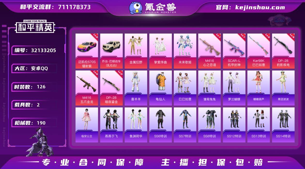 安卓手Q KWF310【无敌战神框】【3粉装8特效枪2载具 二级迈凯伦 金属狂野/挚爱序曲/未来歌姬/临安公主/喜羊羊/莱茵河畔】61958热力值-19王牌印记-126套装-190枪皮 【红色载具】:迈凯伦570S(镭射紫)(二级) 【热门品类】:套装-龟仙人 【粉色套装】:粉装-金属狂野,粉装-挚爱序曲,粉装-未来歌姬 【粉色枪皮等级】:SCAR-L-机甲封神(七级),M416-五爪金龙(四级),M416-心之恋语(七级),ACE32-萌骑漫游(二级),Kar98K-巳巳如意(五级),Mk14-福马献瑞
