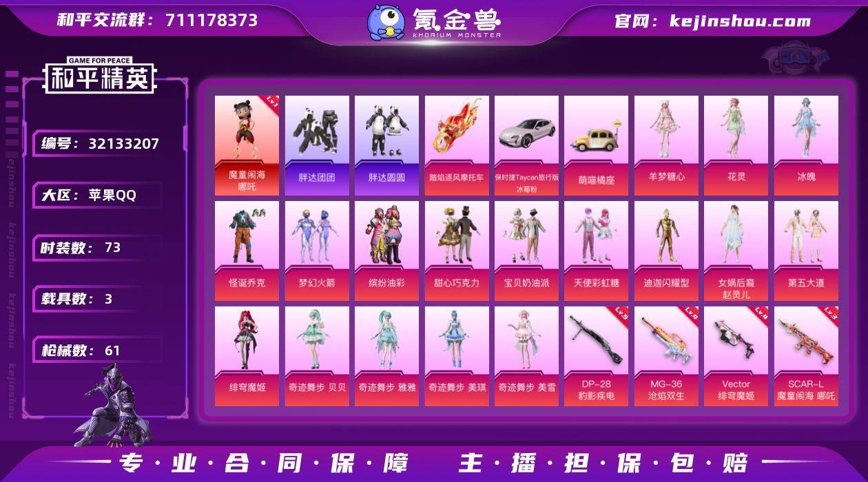YZJ12081 可二次 苹果Q-【极品精氪素材男女一体号 多套主播同款网红穿搭手慢无! 魔童脑海哪吒主页背景 集结舱-玉虚云舱 网红伙伴美月兔! 魔童哪吒全套! 小丑[怪诞] 女娲后裔-赵灵儿 金迪迦 新火箭少女 巧克力三姐妹 权威小番茄 猪妹 团团圆圆 美琪美雪贝贝 羊梦糖心 第五 花灵 软软马卡龙 兔兔白日梦 细狗申公豹 蛇蝎美人 敖闰 糯粉咩咩 青蛙服 密露汐语 红眼罩】1红装4载具17粉装6特效枪10热门73套装61枪皮 32704热力值 历史荣耀皇冠Ⅲ 【1红装】 魔童闹海-哪吒 (1级) 【4载具】 保时捷Taycan旅行版(冰莓粉) 萌喵橘座 踏焰逐风摩托车 萌兔起飞僚机 【17粉装】 冰魄 梦幻火箭 赵灵儿 奇迹舞步美雪 奇迹舞步贝贝 奇迹舞步美琪 奇迹舞步雅雅 绯穹魔姬 宝贝奶油派 天使彩虹糖 甜心巧克力 花灵 怪诞乔克 羊梦糖心 缤纷油彩 第五大道 闪耀迪迦型 【6特效枪】 SCAR-L-魔童闹海哪吒 (3级) Vector-绯穹魔姬 (4级) MG-36-沧焰双生 (4级) DP-28-豹影疾电 (5级) 蜜獾-荧海星豚 (2级) M417-第五大道 (2级) 【10热门】 红熊茄茄 软软马卡龙 糯粉咩咩 兔兔白日梦 胖达圆圆 胖达团团 暗影哥特 迪迦奥特曼 破蛋小黄鸡 极速红龙 【2头盔】 梦幻火箭头盔 甜心宝贝头盔 【1背包】 甜心宝贝背包 营地ID:1014634300