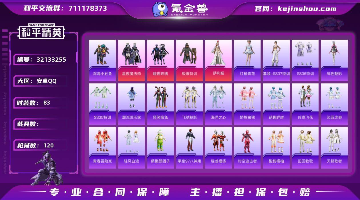【和平精英】4粉装,5特效枪,0载具,历史最高段位:卓越王牌8星 王牌印记6次 热力值:70270,192套装,249枪械,281装备,141战备;套装:套装-极限特训,套装-星夜魔法师,套装-暗夜玫瑰,角色-萨利娅,套装-特训学院,套装-猎鹰,套装-青年教官,套装-橘黑制服,套装-红色运动,套装-黄色运动,套装-蓝色运动,套装-黄色伏地魔,套装-白色伏地魔,套装-黑色伏地魔,套装-竞技名士,套装-深蓝色名流,套装-酒红色名流,套装-湖蓝色名流,套装-黄色名流,套装-猛禽,套装-棕色飞行服,套装-游猎者,套装-长空猛禽,套装-竞技勇士朋克,套装-黎明保卫者,套装-海岛探路者,套装-旭日情侣,套装-冷焰舞者,套装-灼焰舞者,套装-刚毅裁决者,套装-浪漫天命,套装-特战装甲,套装-战地菁英,套装-战地督导,套装-灰色格斗者,套装-春日漫步,套装-潮流先锋,套装-燃烧卡路里,套装-滨海假日,套装-完美偶像,套装-人气偶像,套装-幻影武者,套装-海滨突袭者,套装-街头潮人,套装-蓝彩潮人,套装-神秘领域,套装-决胜时刻,套装-魅力单车,套装-绮丽涂鸦,套装-S6赛事,套装-坚韧舞者,套装-竞技达人朋克,套装-夜莺强袭者,套装-野性战心,套装-超能勇士,套装-破晓战魂,套装-SS1特训,套装-都市魅力,套装-沙漠兵团,套装-SS2特训,套装-雪山精英,套装-传奇侦探,套装-幻世战舞者,套装-迅捷狂鲨,套装-呆萌铁蟹,套装-深海小丑鱼,套装-夏日倾情,套装-甜蜜熊情侣,套装-青涩时光,套装-缤纷果语,套装-龙魂突击队,套装-冰川特警,套装-元素星魂,套装-极速红龙,套装-海上生明月,套装-SS3特训,套装-小丑鱼,套装-SS4特训,套装-粉红小猪,套装-破蛋小黄鸡,套装-疯狂小兔子,套装-SS5特训,套装-圣诞大吉,套装-好奇恐龙,套装-北国孤狼,套装-SS6特训,套装-拳皇97八神庵,套装-炽焰拳师,套装-格斗专家,套...