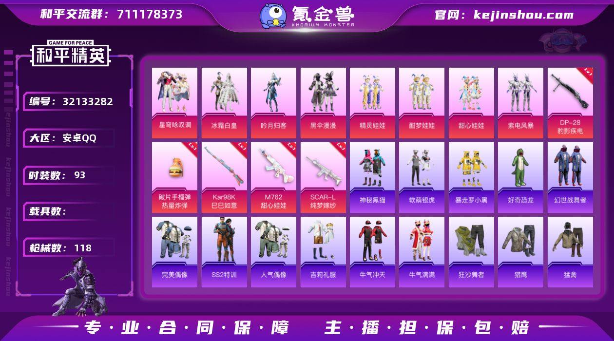 【8粉装5特效枪可秒换绑】 安卓Q区-38953热力值-4印记-93套装-118枪皮 【8粉装】 冰霜白皇 甜心娃娃 酣梦娃娃 精灵娃娃 紫电风暴 吟月归客 黑伞漫漫 星穹咏叹调【5特效枪】 SCAR-L-纯梦嫁纱(6级) M762-甜心娃娃(6级) 破片手榴弹-热量炸弹(7级) Kar98K-巳巳如意(5级) DP-28-豹影疾电(5级)【31热门】 M416-神秘黑猫 GROZA-异彩先驱 GROZA-蓝莓炮弹 长空猛禽 异彩先驱 牛气冲天 霓虹极客 妙红点点 浪漫天命 神秘黑猫 好奇恐龙 软萌银虎 破蛋小黄鸡 暴走罗小黑 暗影哥特(红眼罩) 团圆交子 瑞龙福将 狂沙舞者 冰公主 SS25特训 SS23特训 SS22特训 SCAR-L-玉兔迎春 GROZA-田园牧歌 M762-天降萌叽 M762-彩虹符号 Mk47-乌木金纹 MG3-幻世战舞者 AKM-霓虹街区【3飞行器】 星之彼岸飞行器 萌物绒绒飞行器 炫彩糖果飞行器 营地ID:795037562
