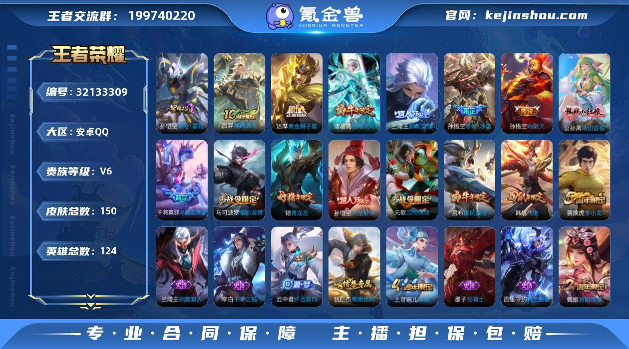 【WZ181149】安卓Q-V6-尊贵铂金III段位-124英雄-150皮肤-6传说-30史诗【传说皮肤】:后羿神树通天,兰陵王默契交锋,诸葛亮时雨天司,孙悟空零号赤焰,达摩黄金狮子座,孙悟空地狱火【限定皮肤】:狄仁杰阴阳师,赵云皇家上将,嬴政优雅恋人,吕布御风骁将,周瑜赤莲之焰,元歌云间偶戏,夏侯惇朔风刀,甄姬游园惊梦,典韦穷奇,马可波罗暗影游猎,狄仁杰魔术师,狄仁杰万华元夜,达摩星际陆战队,达摩沙漠行僧,项羽海滩派对,老夫子醍醐杖,程咬金演武夺筹,韩信飞衡,兰陵王默契交锋,兰陵王驯魔猎人,兰陵王金庭之子,亚瑟潮玩骑士王,孙悟空大圣娶亲,孙悟空零号赤焰,牛魔御旌,李元芳银河之约,李元芳云中旅人,钟馗驱傩正仪,干将莫邪冰霜恋舞曲,雅典娜单词大作战,蔡文姬繁星吟游,鬼谷子原初探秘者,诸葛亮时雨天司,铠青龙志,苏烈千军破阵,弈星混沌棋,沈梦溪星空之诺,明世隐疑决卦,裴擒虎李小龙,米莱狄胡桃异想国,云中君纤云弄巧,盾山御銮,猪八戒西部大镖客,上官婉儿梁祝,蒙犽狂想玩偶喵,桑启海盐诗旅【年限皮肤】:铠青龙志,韩信飞衡,诸葛亮时雨天司,吕布御风骁将【赛季限定】:典韦穷奇,牛魔御旌,盾山御銮,夏侯惇朔风刀,弈星混沌棋,明世隐疑决卦,老夫子醍醐杖,鬼谷子原初探秘者,狄仁杰万华元夜,程咬金演武夺筹,钟馗驱傩正仪,苏烈千军破阵,达摩沙漠行僧,兰陵王金庭之子,李元芳云中旅人,桑启海盐诗旅【战令限定】:兰陵王驯魔猎人,周瑜赤莲之焰,李元芳银河之约,沈梦溪星空之诺,马可波罗暗影游猎,猪八戒西部大镖客,蒙犽狂想玩偶喵,雅典娜单词大作战,元歌云间偶戏,亚瑟潮玩骑士王,米莱狄胡桃异想国,达摩星际陆战队【史诗皮肤】:公孙离涂山容容,米莱狄胡桃异想国,吕布御风骁将,元歌云间偶戏,云中君纤云弄巧,裴擒虎李小龙,蒙犽狂想玩偶喵,马可波罗暗影...