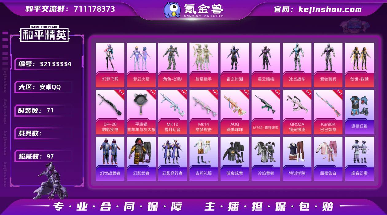 【ky485】安卓 手Q-5粉装-4特效枪-0载具-1粉色飞行器-66214热力值-16王牌印记-170套装-218枪皮 【热门品类】:套装-派对舞王,套装-深海小丑鱼,角色-军刀雅典娜,套装-龟仙人 【粉色套装】:粉装-幻影战神,粉装-蝶舞迷情,粉装-香水柠檬,粉装-闲梦青缨,粉装-星穹咏叹调 【粉色枪皮等级】:Vector-环太平洋(七级),Kar98K-巳巳如意(五级),Mk14-福马献瑞(五级),DP-28-豹影疾电(五级) 【粉色枪皮】:Vector-环太平洋,Kar98K-巳巳如意,Mk14-福马献瑞,DP-28-豹影疾电 【粉色飞行器】:炫彩糖果飞行器 【粉色降落伞】:香水柠檬降落伞,洛神天依降落伞,天之羽翼降落伞,环太平洋降落伞,音爆索尼克降落伞,仲夏莫吉托降落伞,精灵梦叶罗丽降落伞,千金淑猫降落伞,智耀战神降落伞,星穹咏叹调降落伞,炫彩糖果降落伞 【稀有套装】:套装-龟仙人,套装-巳巳如意,套装-雪国风尚,套装-炫彩糖果,套装-雏菊兔兔,套装-萝兰蝴蝶,套装-火种守卫者,套装-糖糖葫芦,套装-青团波波,套装-棉花软糖,角色-许七安,套装-燕燕于飞,套装-鱼渊荷华,套装-粉恋花,套装-紫幽梦,套装-蓝冰羽,角色-瑰梦爱神,套装-星渊小夜曲,套装-朱霞炽焰,套装-凌霄紫焰,套装-擎苍青焰 【稀有枪皮】:AUG-冰晶雪宝,AKM-夜灯,AKM-彩虹符号,AKM-环太平洋,AKM-破晓战魂,AKM-龙的传人,M16A4-夜灯,M16A4-幻世战舞者,M16A4-红色方程式,M16A4-蓝色火焰,SCAR-L-夜灯,SCAR-L-炫彩节奏,SCAR-L-玉兔迎春,SCAR-L-红色方程式,M416-糯团青竹,M416-红色方程式,M416-蓝色火焰,GROZA-彩虹符号,GROZA-恐龙拽拽,GROZA-懵萌河马,GROZA-治愈之星,GROZA-田园牧歌,AUG-天降萌叽,AUG-耀粉歌者,QBZ-彩虹符号,M762-天降萌叽,M762-彩虹符号,M762-暗夜鎏金,M762-登顶巅峰,Mk47-洛神天依,G36C-懵萌河马,AC-VAL-天降萌叽,AC-VAL-...