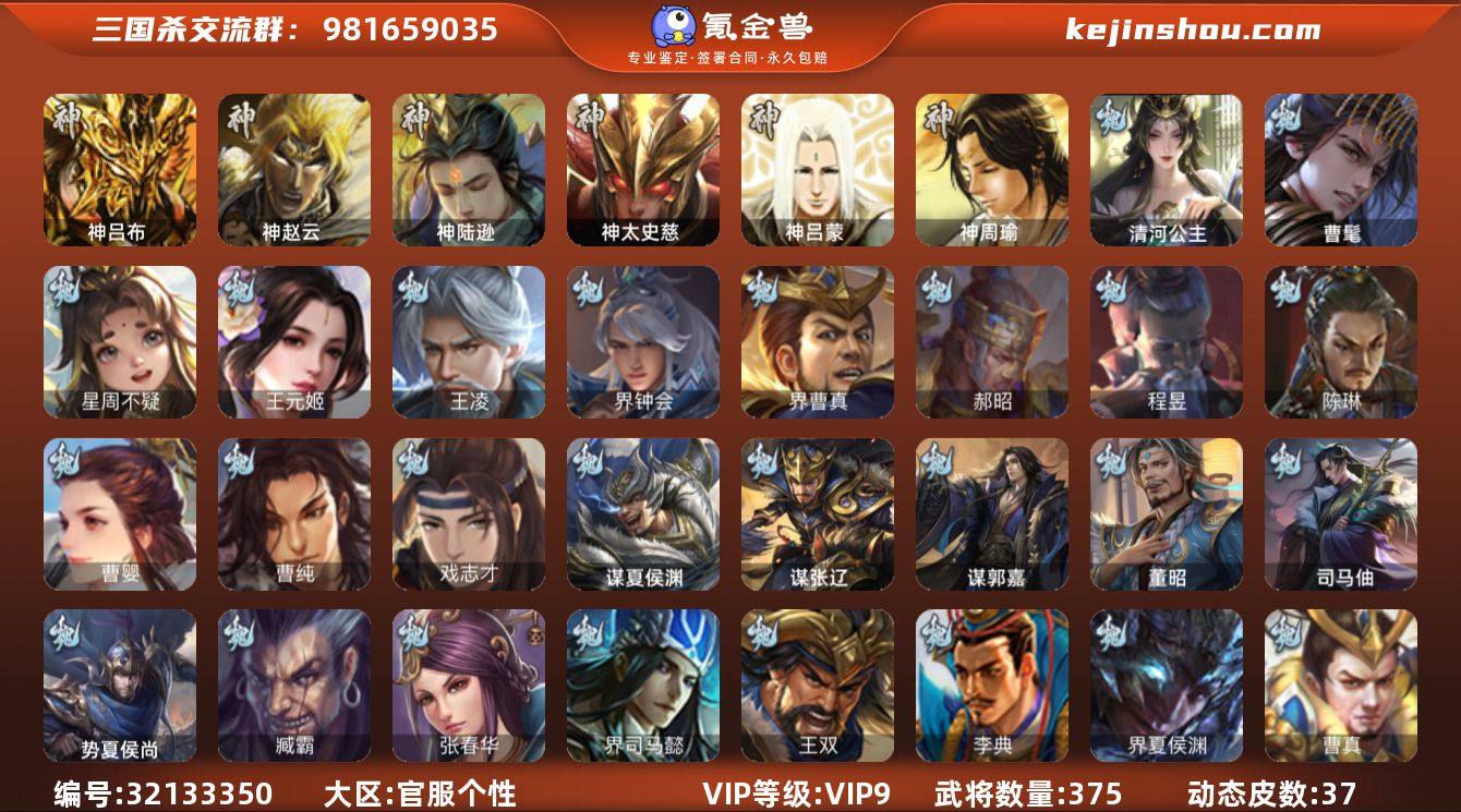 【3978】官阶:大将军;VIP等级:VIP9;史诗武将数量:49;动态皮肤数量:37;武将总数:375;史诗宝珠数量:0;将魂数量:1738;神将:4;魏国史诗武将:28;蜀国史诗武将:11;吴国史诗武将:6;群史诗武将:16
