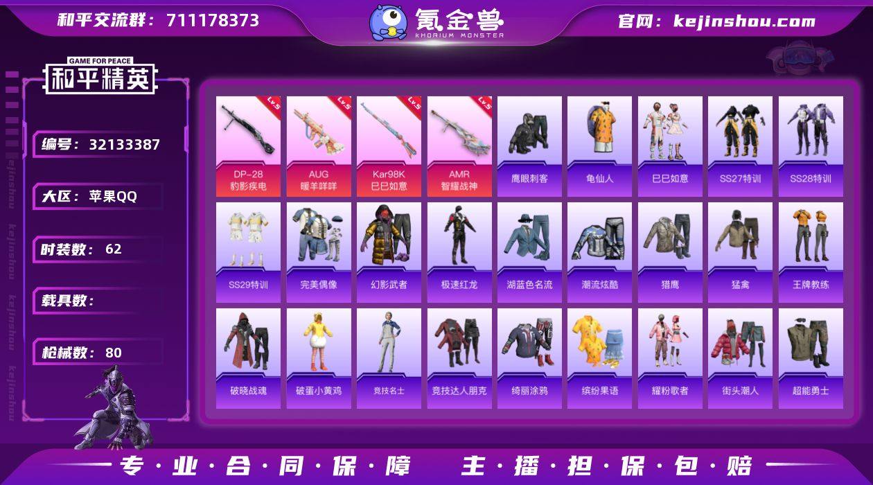 苹果 手Q-0粉装-6特效枪-0载具-1粉色飞行器-22100热力值-1王牌印记-62套装-80枪皮 【热门品类】:套装-龟仙人 【粉色枪皮等级】:AUG-暖羊咩咩(五级),ACE32-萌骑漫游(五级),Kar98K-巳巳如意(五级),Mk14-福马献瑞(五级),AMR-智耀战神(五级),DP-28-豹影疾电(五级) 【粉色枪皮】:AUG-暖羊咩咩,ACE32-萌骑漫游,Kar98K-巳巳如意,Mk14-福马献瑞,AMR-智耀战神,DP-28-豹影疾电 【粉色飞行器】:炫彩糖果飞行器 【粉色降落伞】:绝对恒星降落伞,幻影战神降落伞,极意拳锋降落伞,炫彩糖果降落伞 【稀有套装】:套装-龟仙人,套装-巳巳如意,套装-雪国风尚,套装-炫彩糖果,套装-马上有钱 【稀有枪皮】:AUG-冰晶雪宝,AKM-破晓战魂,M416-红色方程式,GROZA-影袭,AUG-耀粉歌者,M762-彩虹符号,M762-登顶巅峰,蜜獾-天降萌叽,UZI-啾咪啾咪,UZI-天降萌叽,UZI-影袭,UMP45-夜灯,UMP45-生命誓言,UMP45-金玉无双,Vector-生命誓言,汤姆逊-炫彩节奏,汤姆逊-像素花束,AKS-74U-鬼刀,P90-巳巳如意,Kar98K-影袭,M24-影袭,S686-生命誓言,S12K-破晓战魂,S12K-夜灯,DBS-荧海星豚,M249-破晓战魂,MG3-幻世战舞者,破片手榴弹-巳巳如意 【其他套装】:套装-SS27特训,套装-SS28特训,套装-SS29特训,套装-完美偶像,套装-幻影武者,套装-极速红龙,套装-湖蓝色名流,套装-潮流炫酷,套装-猎鹰,套装-猛禽,套装-王牌教练,套装-破晓战魂,套装-破蛋小黄鸡,套装-竞技名士,套装-竞技达人朋克,套装-绮丽涂鸦,套装-缤纷果语,套装-耀粉歌者,套装-街头潮人,套装-超能勇士,套装-长空猛禽,套装-青春校园,套装-青涩时光,套装-魅力单车,套装-鹤鸣,套装-黄色伏地魔,套装-黄色名流,套装-黑色伏地魔,套装-龙的传人,套装-龟仙人,套装-鹰眼刺客,套装-冰冻风暴,套装-漫步者,套装-星梦畅游 【营地ID】:...