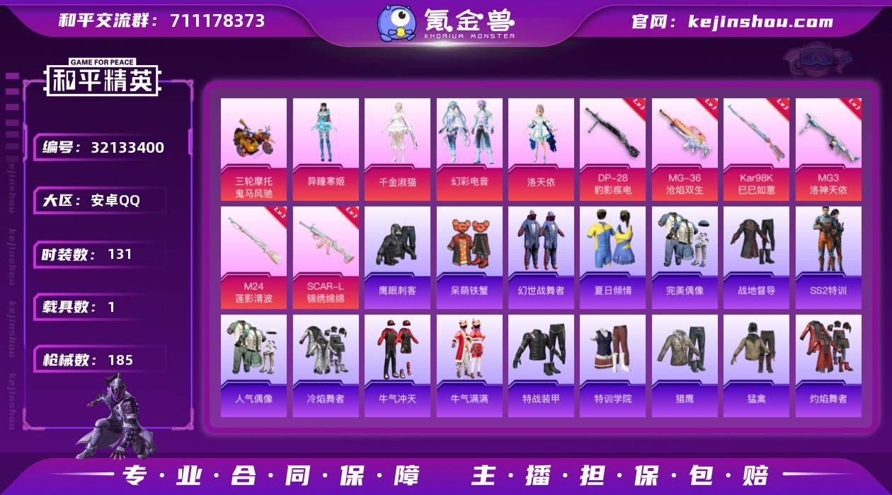 【洛天依5粉装6特效枪1载具可秒换绑】 安卓Q区-50751热力值-9印记-131套装-185枪皮 【1载具】 鬼马风驰【5粉装】 洛天依 幻影飞狐 幻彩电音 角色-千金淑猫 角色-异瞳寒姬【6特效枪】 M24-莲影清波(6级) SCAR-L-锦绣绵绵(5级) MG3-洛神天依(7级) Kar98K-巳巳如意(5级) DP-28-豹影疾电(5级) MG-36-沧焰双生(5级)【29热门】 M416-罗小黑 M416-蓝色火焰 长空猛禽 弄潮海豚 牛气冲天 霓虹街区 妙红点点 懵萌河马 浪漫天命 鹰眼刺客 破蛋小黄鸡 小丑鱼 白色伏地魔 SS27特训 SS26特训 SS25特训 SS24特训 SS22特训 Mk47-洛神天依 AWM-飒粉甜心 SCAR-L-玉兔迎春 M762-天降萌叽 Mk47-乌木金纹 SKS-糯团青竹 M249-彩虹符号 MG3-幻世战舞者 呆萌铁蟹【2飞行器】 粉色滑翔尾迹 火焰蝠人飞行服 营地ID:936980207