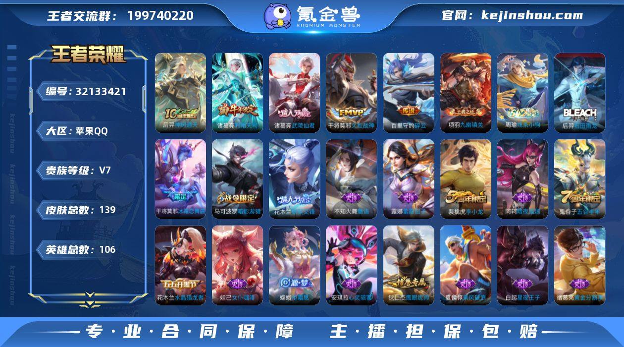 【WZ181146】苹果Q-V7-最强王者段位-106英雄-139皮肤-5传说-34史诗【传说皮肤】:后羿神树通天,百里守约碎云,诸葛亮时雨天司,干将莫邪久胜战神,诸葛亮武陵仙君【限定皮肤】:狄仁杰阴阳师,赵云皇家上将,高渐离死亡摇滚,高渐离玩趣恶龙,马可波罗暗影游猎,狄仁杰魔术师,狄仁杰万华元夜,达摩沙漠行僧,项羽海滩派对,老夫子醍醐杖,程咬金演武夺筹,兰陵王金庭之子,花木兰默契交锋,李元芳云中旅人,钟馗驱傩正仪,干将莫邪冰霜恋舞曲,干将莫邪胡桃夹子,雅典娜黎明之约,鬼谷子原初探秘者,鬼谷子五谷丰年,诸葛亮武陵仙君,诸葛亮时雨天司,苏烈千军破阵,百里玄策原初追逐者,弈星混沌棋,梦奇顽趣,沈梦溪大漠名商,明世隐疑决卦,裴擒虎李小龙,裴擒虎擒涛扼浪,猪八戒西部大镖客,嫦娥拒霜思,鲁班大师探海日志,桑启海盐诗旅,张良古海寻踪,蒙恬荣光圣徽,鬼谷子天穹祈灯,刘邦剑破天穹,周瑜熔金海岸【年限皮肤】:诸葛亮时雨天司【赛季限定】:弈星混沌棋,明世隐疑决卦,老夫子醍醐杖,鬼谷子原初探秘者,狄仁杰万华元夜,程咬金演武夺筹,钟馗驱傩正仪,苏烈千军破阵,达摩沙漠行僧,兰陵王金庭之子,沈梦溪大漠名商,李元芳云中旅人,桑启海盐诗旅,裴擒虎擒涛扼浪,鲁班大师探海日志,张良古海寻踪,鬼谷子天穹祈灯,刘邦剑破天穹,太乙真人谧流熔炉,钟馗虚灵犬护,甄姬逆浪荇歌,百里玄策原初追逐者,雅典娜黎明之约,梦奇顽趣,蒙恬荣光圣徽,项羽九幽镇关【战令限定】:马可波罗暗影游猎,猪八戒西部大镖客,孙膑茶境仙,马超访茗客,周瑜线条小狗【史诗皮肤】:周瑜线条小狗,项羽九幽镇关,后羿石田雨龙,孙膑茶境仙,蒙恬荣光圣徽,梦奇顽趣,鬼谷子五谷丰年,雅典娜黎明之约,嫦娥拒霜思,钟馗乐园奇幻夜,花木兰默契交锋,裴擒虎李小龙,百里玄策原初追逐者,马可波罗暗影游猎,...