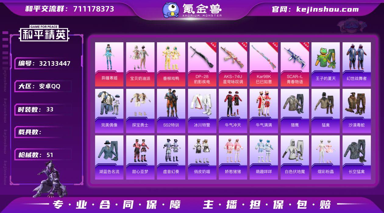 【3粉装4特效枪可秒换绑】 安卓Q区-14762热力值-2印记-33套装-51枪皮 【3粉装】 宝贝奶油派 垂柳戏鸭 角色-异瞳寒姬【4特效枪】 SCAR-L-青春物语(4级) AKS-74U-星穹咏叹调(3级) Kar98K-巳巳如意(4级) DP-28-豹影疾电(1级)【17热门】 M416-蓝色火焰 长空猛禽 虚音幻奏 甜心亚梦 牛气冲天 白色伏地魔 SS22特训 Mini14-梦幻火箭 Kar98K-王子的夏天 AKM-环太平洋 SCAR-L-玉兔迎春 Mk47-乌木金纹 Mini14-旋转彩虹 UZI-娇憨猪猪 S12K-垂柳戏鸭 MG3-幻世战舞者【2飞行器】 粉色滑翔尾迹 太空嘟嘟飞行器 营地ID:974239113