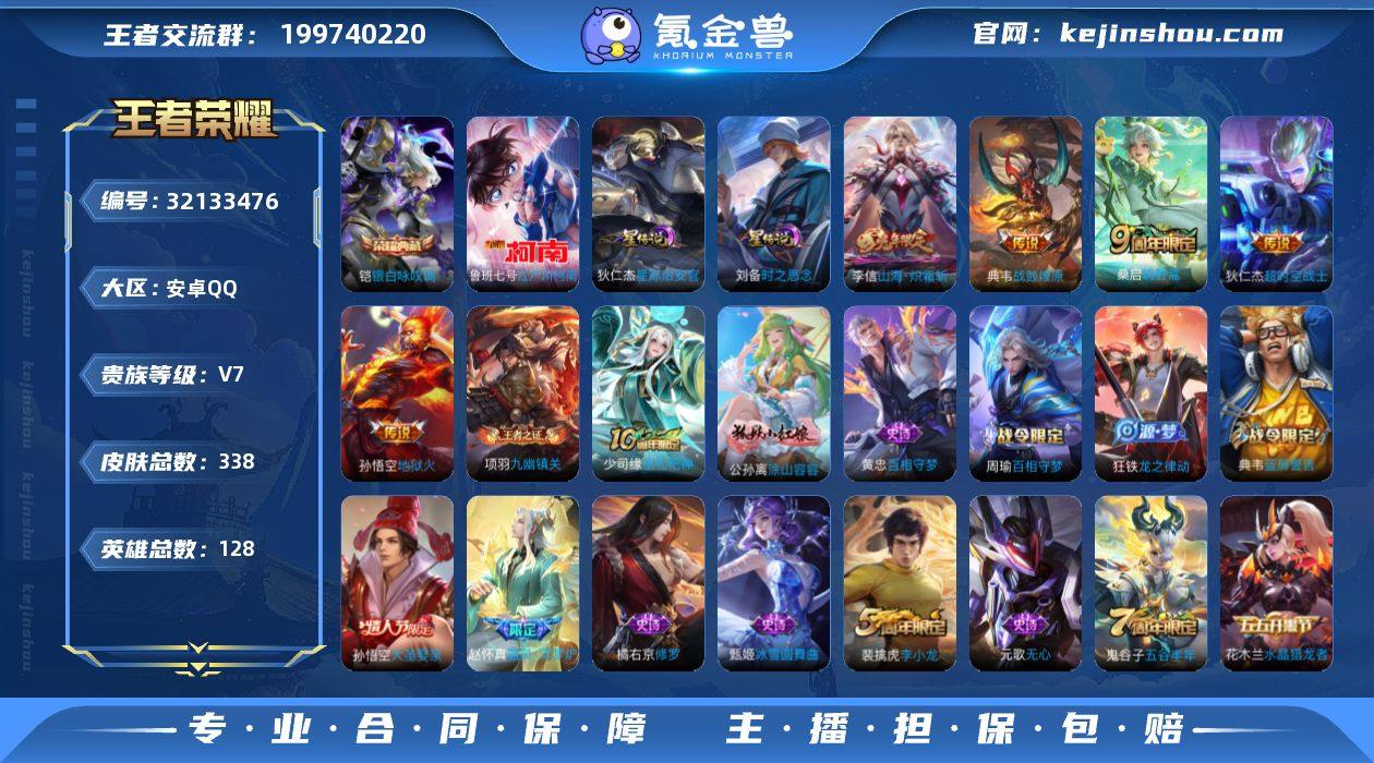 V7 1典藏 1珍品 5传说 2星元 338皮肤 128英雄 【1水晶】铠-银白咏叹调【1珍品传说】鲁班七号-江户川柯南【5传说】李信-山海·炽霜斩,狄仁杰-超时空战士,孙悟空-地狱火,典韦-战鼓燎原,桑启-鸣野蒿【2星元】狄仁杰-星际治安官,刘备-时之思念【61史诗】元歌-无心,鬼谷子-五谷丰年,赵云-未来纪元,钟无艳-超时空战士,阿轲-节奏热浪,安琪拉-心灵骇客,白起-星夜王子,百里守约-特工魅影,百里玄策-原初追逐者,蔡文姬-舞动绿茵,曹操-幽灵船长,程咬金-功夫厨神,妲己-女仆咖啡,妲己-魅力维加斯,狄仁杰-魔术师,狄仁杰-鹰眼统帅,典韦-蓝屏警告,貂蝉-圣诞恋歌,伽罗-箭羽风息,公孙离-无限星赏官,宫本武藏-鬼剑武藏,韩信-白龙吟,花木兰-水晶猎龙者,橘右京-修罗,兰陵王-暗隐猎兽者,李白-千年之狐,李元芳-逐浪之夏,廉颇-地狱岩魂,刘禅-绅士熊喵,吕布-圣诞狂欢,吕布-末日机甲,墨子-金属风暴,墨子-龙骑士,上官婉儿-梁祝,裴擒虎-李小龙,孙策-猫狗日记,孙尚香-水果甜心,孙悟空-大圣娶亲,王昭君-偶像歌手,夏侯惇-乘风破浪,小乔-缤纷独角兽,亚瑟-心灵战警,杨玉环-遇见飞天,嬴政-摇滚巨星,嬴政-暗夜贵公子,嬴政-白昼王子,张飞-乱世虎臣,赵云-皇家上将,甄姬-冰雪圆舞曲,甄姬-游园惊梦,庄周-高山流水,镜-青焰无极,蒙恬-荣光圣徽,弈星-万物之道,赵怀真-器灵·浮梦炉,狂铁-龙之律动,周瑜-百相守梦,黄忠-百相守梦,公孙离-涂山容容,项羽-九幽镇关,少司缘-巫礼祀神