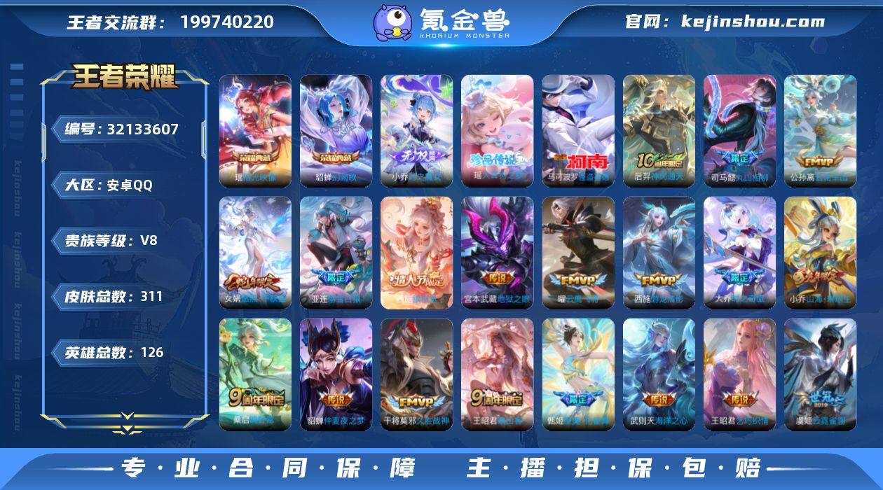 【王者荣耀】珍品无双0 典藏2 无双1 珍品传说2 传说27 史诗92 英雄126 皮肤311 贵族8级 荣耀典藏:幻阙歌|拾光映像__无双皮肤:时之魔女__珍品传说:怪盗基德|大耳狗之梦__传说皮肤:鸣野蒿|绛天战甲|启明星使|地狱之眼|海洋之心|仲夏夜之梦|云霓雀翎|久胜战神|黄金白羊座|刘备-时之恋人|云鹰飞将|游龙清影|乞巧织情|大乔-时之奇旅|落雪白狼|貂蝉-曦玄引|周瑜-音你心动|山海·琳琅生|朵莉亚-心动手记|至美·化雀舞|映山客|牧神诗旅|愿照·千秋盛|续相思|云诺千山|九山相柳|神树通天__稀有限定:大圣娶亲|一生所爱|蔷薇恋人|白鹤梁神女|女儿国国王|玉兔公主|神器·万象笔|狮舞东方|大漠名商|地狱燃心|繁星吟游|古海寻踪|海滩派对|海盐诗旅|皇家上将|剑破天穹|江河有灵|狂想玩偶喵|蓝屏警告|魔术师|奇幻香踪|千军破阵|擒涛扼浪|青焰无极|燃音魔法|沙漠行僧|探海日志|天狼绘梦者|天穹祈灯|妄想食味|无心|纤云弄巧|阴阳师|原初追逐者|云端筑梦师|云间偶戏|逐梦之音|暗夜贵公子|暗隐猎兽者|缤纷独角兽|冰冠公主|冰雪圆舞曲|大乔-猫狗日记|德古拉伯爵|地狱岩魂|功夫厨神|鬼剑武藏|唤灵魅影|黄金分割率|箭羽风息|节奏热浪|金属风暴|李元芳-蔬乡物语|吕布-末日机甲|魅力维加斯|魅语|梦奇-顽趣|女仆咖啡|偶像歌手|青蛇|绅士熊喵|圣诞恋歌|诗语江南|鲁班七号-蔬乡物语|水果甜心|水晶猎龙者|滕王阁序|晚萤|赵云-未来纪元|星夜王子|摇滚巨星|鹰眼统帅|幽灵船长|月团寄思|至美·乘鲤谣|逐浪之夏|百里守约-百相守梦|老夫子-百相守梦|噬灭天穹|敬我三分|破空之剑|战舞者|涂山红红|顽岩魄|蔡文姬-夏日便利店|虞姬-夏日便利店|天穹之誓|安琪拉-时之奇旅|心灵战警|孙尚香-时之恋人|无限星赏官|心灵骇客|茶境仙|星界战将|谧流熔炉|化蝶舞|云中旅人|玲珑珍味|孙悟空-神迹守卫|达摩-星际陆战队|流音漫舞|访茗客|暖冬·兔眠|灵卜魔法|苍威无极|刘禅-...