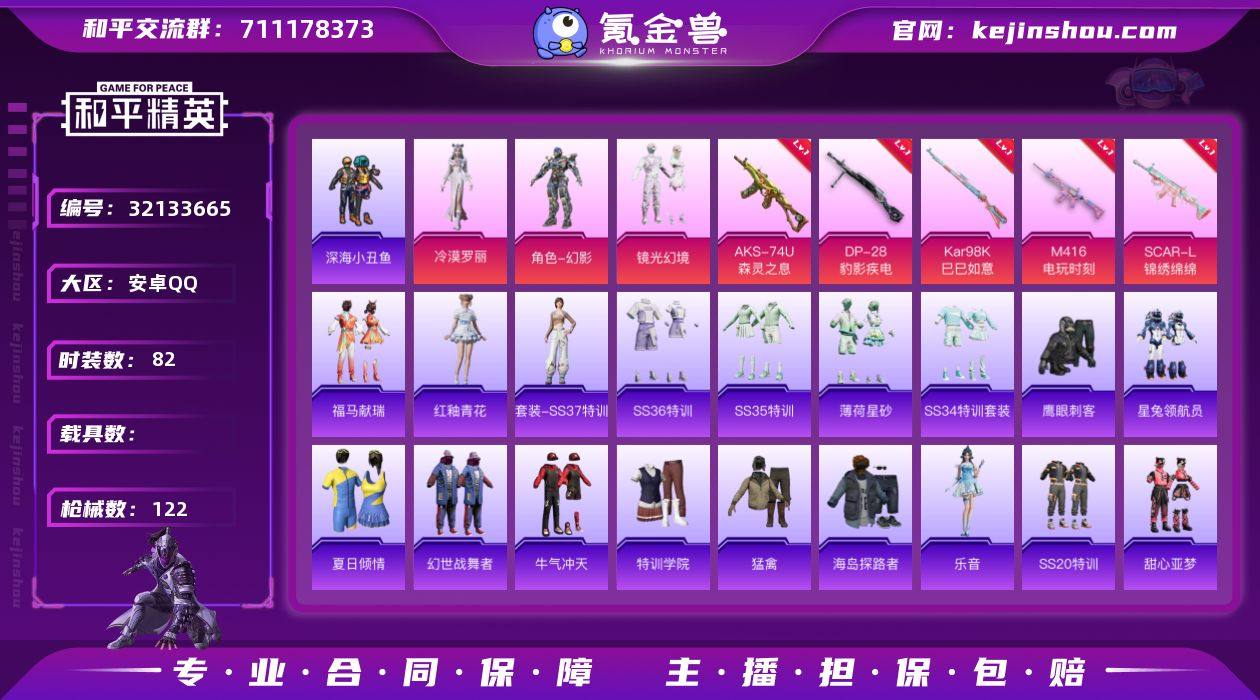 【小丑鱼6特效枪2粉装 小黑屋165小时 秒换绑不用等】 安卓Q区-32005热力值-82套装-122枪皮 【2粉装】 镜光幻境 角色-冷漠罗丽【6特效枪】 AKS-74U-森灵之息(4级) AA12-G-萌骑幻想(2级) SCAR-L-锦绣绵绵(5级) Kar98K-巳巳如意(5级) M416-电玩时刻(5级) DP-28-豹影疾电(5级)【120热门】 鹰眼刺客 小丑鱼 英勇保护者 SS27特训 SS24特训 SS23特训 SS22特训 AKM-缤纷海域 M762-天降萌叽 Mk47-乌木金纹 Mini14-旋转彩虹 UZI-娇憨猪猪 UMP45-蓝色火焰 MG3-幻世战舞者 M416-暗夜行者 M416-蓝色火焰 长空猛禽 虚音幻奏 夏日倾情 甜心亚梦 特训学院 牛气冲天 魅力单车 漫步者 黑色伏地魔 海岛探路者 纯真浪花 粉红小猪 星兔领航员 M762-奇异狩猎者 AA12-G-雨过天青 MK20-H-竞速先锋 顶瓜瓜 M249-无面战甲 冰河战士 MG-36-薄荷星砂 GROZA-福马献瑞 SS34特训 乐音 TMP-9-江南烟雨 大橘大利 SS19特训 SS20特训 SS21特训 龙魂突击队 ACE32-冰晶雪宝 SS28特训 海盐绵绵冰 撬棍-Alan Walker潮音版 M16A4-冰河战士 SS33特训 巳巳如意 蜜獾-精灵梦叶罗丽 雪绒豹 焰鹰斗篷 幽夜迷踪 SS36特训 热情海星 老实芭蕉 Famas-突变脉冲 湖雨初晴 战术大师 银尘 云朵鹅 撬棍-冷漠罗丽 狙击之神 M416-糯团青竹 Kar98K-彩虹符号 撬棍-幻世战舞者 M417-玩趣呆呆 风玲 平底锅-光之冒险 MG3-乌木金纹 燃烧瓶-福马献瑞 Mk14-冰河战士 Mini14-香桃花海 平底锅-甜心亚梦 平底锅-娇憨猪猪 UZI-冰河战士 平底锅-精灵梦叶罗丽 平底锅-属我最6 SS35特训 破片手榴弹-星途旅人 SCAR-L-绯月迷踪 黯羽织刑 VSS-香桃花海 AKM-霓彩脉冲 AUG-异域银装 M24-幻彩电音 R45-幻彩电音 破片手榴弹-拽到爆炸 Fa