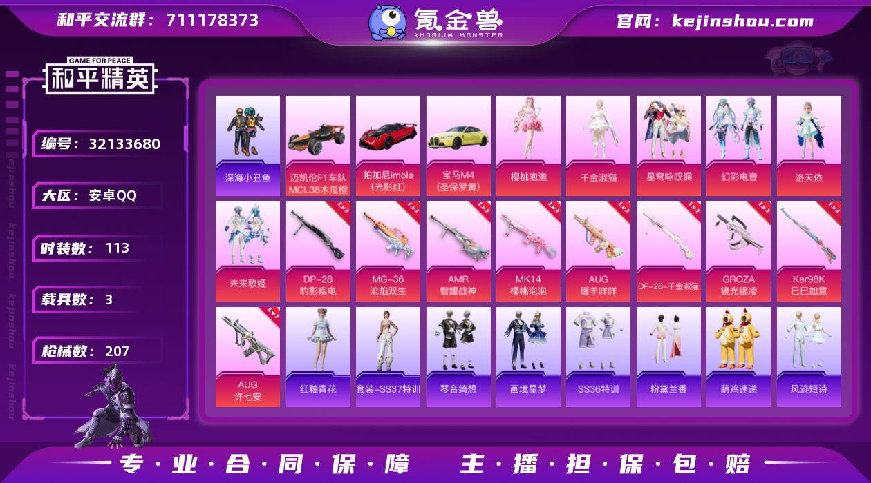 【女号11特效枪6粉装3载具 秒换绑不用等】 安卓Q区-63274热力值-113套装-207枪皮 【3载具】 迈凯伦F1车队 MCL38(木瓜橙) 帕加尼imola(光影红) 宝马M4(圣保罗黄)【6粉装】 洛天依 未来歌姬 角色-樱桃泡泡 星穹咏叹调 幻彩电音 角色-千金淑猫【11特效枪】 Mk14-福马献瑞(5级) AA12-G-萌骑幻想(3级) Mk14-樱桃泡泡(5级) DP-28-千金淑猫(1级) AMR-智耀战神(7级) AUG-许七安(7级) Kar98K-巳巳如意(5级) AUG-暖羊咩咩(5级) GROZA-镜光银凌(5级) DP-28-豹影疾电(5级) MG-36-沧焰双生(5级)【198热门】 破蛋小黄鸡 小丑鱼 迅捷狂鲨 冰川格斗者 SS26特训 SS25特训 SS24特训 SS23特训 SS22特训 Mk47-洛神天依 SCAR-L-玉兔迎春 GROZA-2B战斗服款 GROZA-田园牧歌 M762-天降萌叽 SKS-糯团青竹 DBS-彩虹符号 M249-彩虹符号 长空猛禽 霓虹街区 妙红点点 懵萌河马 黎明保卫者 竞技达人朋克 和煦暖阳 海岛探路者 SKS-青瓷战姬 S1897-糯团青竹 MK20-H-樱桃泡泡 M249-羲和光序 AA12-G-雨过天青 M24-樱桃泡泡 沙漠之鹰-雨过天青 平底锅-画境星梦 M16A4-雨过天青 雨过天青 MG-36-薄荷星砂 GROZA-福马献瑞 恋语绒绒 SS34特训 鲛海歌灵 漫游都市 朱霞炽焰 星渊小夜曲 Vector-动力核心 星影赞美诗 撬棍-冰晶雪宝 AWM-天降萌叽 怀庆长公主 福马献瑞 大橘大利 凌霄紫焰 蓝冰羽 临安公主 SS30特训 ACE32-冰晶雪宝 青团波波 鱼渊荷华 擎苍青焰 糖糖葫芦 P1911-动力核心 沙漠之鹰-羲和光序 M24-天降萌叽 PKM-啾咪啾咪 石蕴玉辉 燕燕于飞 SS31特训 大砍刀-2P战斗服款 SS33特训 SS32特训 AKS-74U-翎光蝶翼 巳巳如意 紫幽梦 MG3-霓彩脉冲 粉黛兰香 SS36特训 MG3-火熔核心 异域银装