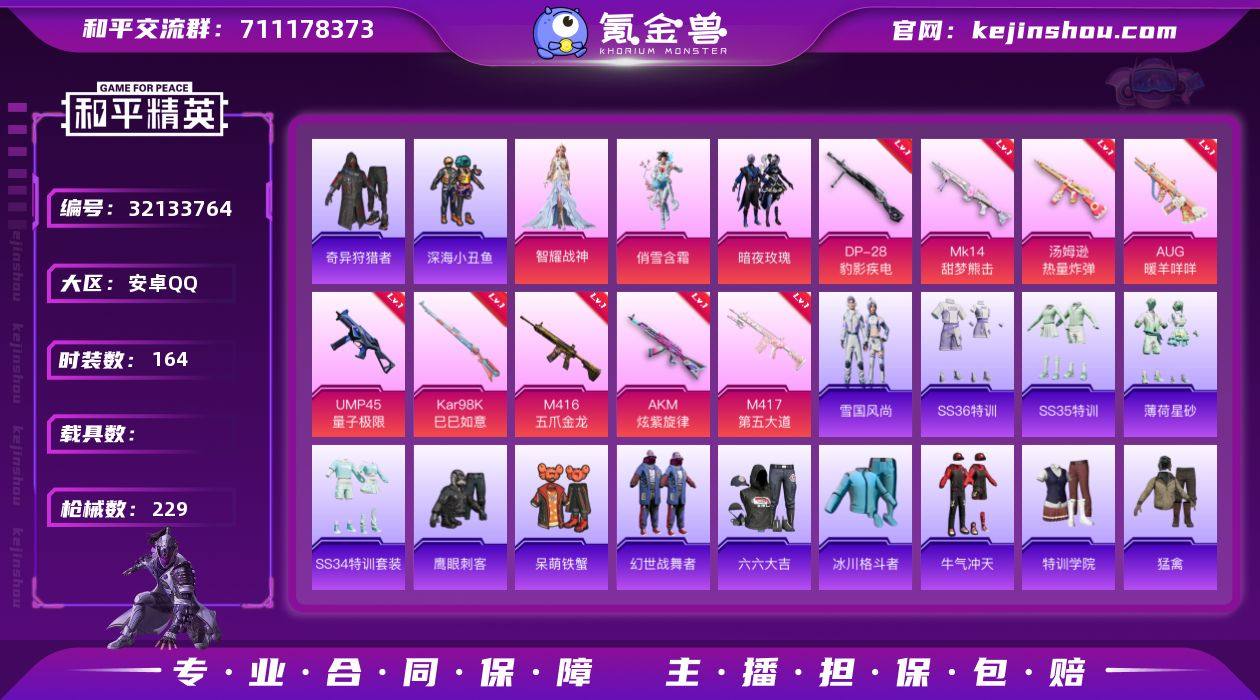 【满级M4五爪金龙9特效枪4粉装 秒换绑不用等】 安卓Q区-70494热力值-164套装-229枪皮 【2稀有】 AKM-百万伏特 Mark.06蓝螳螂【4粉装】 圣堂之誓 暗夜玫瑰 俏雪含霜 角色-智耀战神【9特效枪】 M416-五爪金龙(7级) AKM-炫紫旋律(7级) M417-第五大道(7级) 汤姆逊-热量炸弹(5级) Kar98K-巳巳如意(5级) Mk14-甜梦熊击(5级) AUG-暖羊咩咩(5级) DP-28-豹影疾电(5级) UMP45-量子极限(5级)【205热门】 鹰眼刺客 小丑鱼 深海小丑鱼 金羽特工 暗影哥特(红眼罩) 团圆交子 瑞龙福将 冰川格斗者 白色伏地魔 SS27特训 SS26特训 SS25特训 SS24特训 SS23特训 SS22特训 NV战队服 SCAR-L-玉兔迎春 M762-天降萌叽 M762-彩虹符号 Mk47-乌木金纹 SKS-糯团青竹 UZI-娇憨猪猪 M416-夜灯 UMP45-蓝色火焰 DBS-彩虹符号 M249-彩虹符号 MG3-幻世战舞者 AKM-虎虎生威 AKM-霓虹街区 呆萌铁蟹 M416-蓝色火焰 GROZA-异彩先驱 GROZA-彩虹符号 长空猛禽 异彩先驱 虚音幻奏 甜心亚梦 甜蜜熊情侣 特训学院 青涩时光 牛气冲天 霓虹街区 霓虹极客 妙红点点 懵萌河马 魅力单车 六六大吉 猎鹰 蓝色运动 橘黑制服 竞技勇士朋克 漫步者 S686-奇异狩猎者 红色运动 海岛探路者 纯真浪花 春日漫步 M762-瑞龙福将 S1897-糯团青竹 P90-紫矿核心 AC-VAL-玩趣呆呆 顶瓜瓜 冰河战士 雏菊兔兔 MG-36-薄荷星砂 GROZA-福马献瑞 恋语绒绒 SS34特训 TMP-9-江南烟雨 蜜獾-鸡智如我 AWM-天降萌叽 DBS-创世·救赎 SS18特训 大橘大利 SS14特训 SS16特训 SS17特训 SS19特训 SS20特训 SS21特训 蓝冰羽 龙魂突击队 SS29特训 萝兰蝴蝶 SS30特训 ACE32-冰晶雪宝 青团波波 鱼渊荷华 糖糖葫芦 SS28特训 PKM-啾咪啾咪 海盐