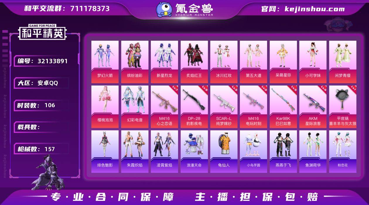 YZJ11699 可二次 安卓Q-1稀有11粉装7特效枪1热门106套装157枪皮 51659热力值 精品女号 791物资币 梦幻火箭 猪妹 第五大道 樱桃泡泡 小可学妹 小白龙 呆萌星弥 小鸟芋圆 幻彩偏偏 荷畔雨呱 彩虹兔 云朵鹅 雪绒豹 满级M416心之恋语 5级斯嘎纯梦嫁纱 4印记 历史超级王牌6星 【1稀有】 浪漫天命 【11粉装】 梦幻火箭 樱桃泡泡 呆萌星弥 小可学妹 闲梦青缨 幻彩电音 缤纷油彩 第五大道 新星烈龙 炙焰红王 冰川红玫 【7特效枪】 SCAR-L-纯梦嫁纱 (5级) M416-心之恋语 (7级) M416-电玩时刻 (5级) Kar98K-巳巳如意 (5级) DP-28-豹影疾电 (5级) AKM-星际浪客 (4级) 平底锅-喜羊羊与灰太狼 (1级) 【1热门】 龟仙人 【1背包】 梦幻火箭背包 营地ID:912832551