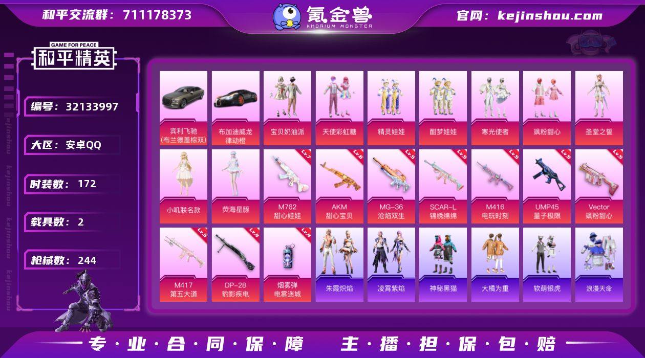 YZJ14089-可二次-安卓Q-1稀有2载具9粉装10特效枪14热门【精品公主号 小叽联名款 荧海星豚 甜心两姐妹 飒粉甜心 暗夜风云 纯白跃动 馥郁金蕊 午间小调 情公主 冬芋恋人 莱茵河畔 粉团憨憨 软羊咩咩 红红火火 大橘为重 天命 6级AK甜心宝贝 许愿神龙-伙伴 3张改名卡】172套装244枪皮 80675热力值 14印记 历史超级王牌12星 【1稀有】 浪漫天命 【2载具】 布加迪威龙(律动橙) 宾利飞驰布罗德盖棕双色 【9粉装】 圣堂之誓 宝贝奶油派 天使彩虹糖 荧海星豚 小叽联名款 飒粉甜心 酣梦娃娃 精灵娃娃 寒光使者 【10特效枪】 SCAR-L-锦绣绵绵 (5级) M416-电玩时刻 (5级) AKM-甜心宝贝 (6级) Vector-飒粉甜心 (5级) MG-36-沧焰双生 (5级) DP-28-豹影疾电 (4级) M762-甜心娃娃 (7级) UMP45-量子极限 (5级) M417-第五大道 (5级) 烟雾弹-电雾迷城 (4级) 【14热门】 龟仙人 浪漫假日 软萌银虎 大橘为重 神秘黑猫 团圆交子 瑞龙福将 粉红小猪 豚鼠丹丹 破蛋小黄鸡 黑色刀锋 M416-仓鼠灰灰 M762-瑞龙福将 Kar98K-深海曼妙 【4飞行器】 暖熊萌萌飞行器 极意拳锋飞行器 炫彩糖果飞行器 机智如我飞行器 【1头盔】 甜心宝贝头盔 【1背包】 甜心宝贝背包 营地ID:709171275