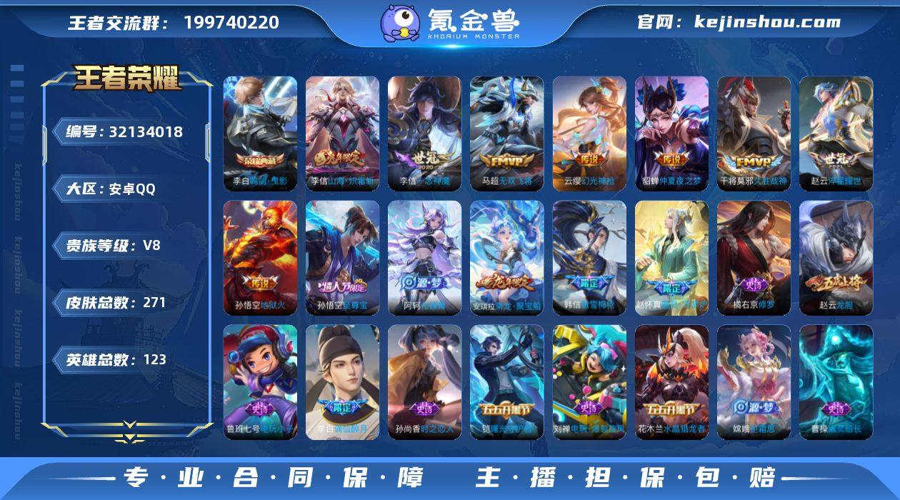 说 123英雄 271皮肤 可修改实名 男号 【英雄全皮】戈娅全皮 【稀有英雄】大司命,韩信(韩跳跳),夏洛特(夏师傅),艾琳,橘右京(橘子),娜可露露(鸟人),不知火舞,赵云,金蝉(唐僧),戈娅 【荣耀水晶】鸣剑·曳影 【传说皮】幻光神枪,神树通天,山海·炽霜斩(李信年限),地狱火,仲夏夜之梦(大飞蛾),一念神魔,淬星耀世,久胜战神,无双飞将,时之恋人-刘备(电焊工) 【珍宝阁皮】女武神,玩趣恶龙 【赛季/战令皮】噬灭天穹(s37),古海寻踪(s33),星界游侠,海盐诗旅(s30),擒涛扼浪(s31),潮玩骑兵,奇幻香踪,探海日志(s32),驭风魔法,玲珑珍味,流音漫舞,地狱燃心,剑破天穹(s35),天穹祈灯(s34),暖冬·兔眠,原初探秘者(s21),万华元夜(s22),演武夺筹(s23),驱傩正仪(s24),千军破阵(s25),潮玩骑士王,云间偶戏,圣弓游侠,真爱魔法,火炮绅士,沙漠行僧(s26),幻夜卜梦,吟游魔法,夜都怪侠,金庭之子(s27),电玩高手(电玩铁子),午后时光,大漠名商(s28),云中旅人(s29),超时空战士-钟无艳,落雪兰心 【史诗皮】谪仙醉月,星界战将,器灵·浮梦炉,乘龙·聚宝船(安琪拉年限),蔬乡物语(鲁班七号),决胜骁骑,化蝶舞,紫霞仙子,苍穹之光,电玩小子(小书包),白龙吟,黄金分割率,千年之狐,蒙恬荣光圣徽,高渐离燃音魔法,百解令(蒙犽),江河有灵,真我赫兹(百里守约),偶像歌手,电玩·爆裂旋风,末日机甲-吕布,猫狗日记-孙策,时之恋人-孙尚香,节奏热浪,修罗,水果甜心,星夜王子,心灵骇客,功夫厨神,暗隐猎兽者,幽灵船长,鬼剑武藏,心灵战警,拒霜思,缤纷独角兽,乘风破浪,逐浪之夏,水晶猎龙者,曙光守护者,热力回旋,金属风暴,圣诞狂欢,鹰眼统帅,魅力维加斯,黎明之约,赏金猎手,无心,未来纪元-赵云 【限定皮】至尊宝,傲雪梅枪,绯月行,时雨天司(水龙头),瑞麟志(木兰年限),高山流水,诗剑行,齐天大圣,怒海麟威,降魔,五谷丰年,青龙志(铠年限),梁祝,龙胆,李小龙,如梦令-后羿,默契交锋-花木兰