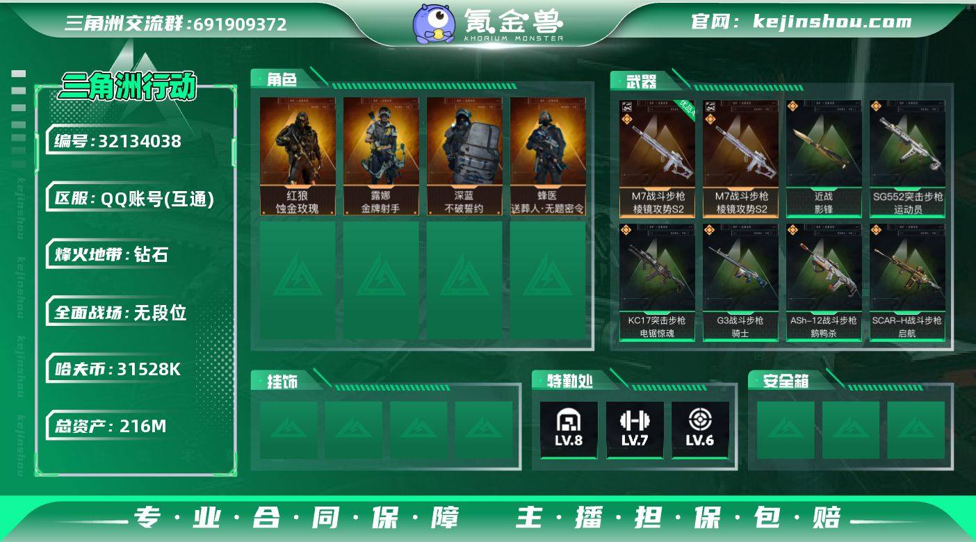 216m总资产-31528k哈伏币-60烽火等级-钻石-5战场等级-无军衔 YY1954 【干员外观】:红狼-蚀金玫瑰,蜂医-送葬人·无题密令,深蓝-不破誓约,露娜-金牌射手 【近战皮肤】:近战-影锋,近战-黑鹰 【典藏外观】:M7战斗步枪-棱镜攻势S2 【典藏外观成色】:M7战斗步枪-棱镜攻势S2(优品A) 【传说外观】:M4A1突击步枪-蚀金玫瑰,M4A1突击步枪-阿米娅,ASh-12战斗步枪-鹅鸭杀,SG552突击步枪-运动员,AK-12突击步枪-特斯拉线圈,SCAR-H战斗步枪-启航,G3战斗步枪-骑士,CAR-15突击步枪-阿米娅,腾龙突击步枪-捞点薯条,KC17突击步枪-电锯惊魂,UZI冲锋枪-特斯拉线圈,SR-3M紧凑突击步枪-特斯拉线圈,勇士冲锋枪-能天使-午夜邮差,QCQ171冲锋枪-鹅鸭杀,725双管霰弹枪-送葬人-无题密令,M250通用机枪-骑士之心,QJB201轻机枪-鹅鸭杀,M14射手步枪-蛮荒,AWM狙击步枪-捞点薯条,93R-捞点薯条,复合弓-黑·天际线 【史诗外观】:AKM突击步枪-林中猎手,ASh-12战斗步枪-星际探索,ASh-12战斗步枪-无极限,K416突击步枪-冬日风情,K416突击步枪-阿萨拉特攻,M16A4突击步枪-竞赛选手,AUG突击步枪-蝮蛇,M7战斗步枪-百步穿杨,SG552突击步枪-深海恐惧,G3战斗步枪-流沙送葬,AS Val突击步枪-百步穿杨,腾龙突击步枪-无垢,K437突击步枪-守护者,MP5冲锋枪-深海恐惧,MP5冲锋枪-战术竞备,MP5冲锋枪-竞技风,Vector冲锋枪-猎鳄行动,Vector冲锋枪-百步穿杨,SR-3M紧凑突击步枪-荒野求生,SR-3M紧凑突击步枪-战术竞备,勇士冲锋枪-深海恐惧,勇士冲锋枪-工业狂潮,MP7冲锋枪-无垢,MP7冲锋枪-守护者,M1014霰弹枪-林中猎手,PKM通用机枪-荒野求生,PKM通用机枪-阿萨拉特攻,M249轻机枪-丛影谍踪,QJB201轻机枪-炽焰,Mini-14射手步枪-守护者,VSS射手步枪-丛影谍踪,SVD狙击步枪-荒野求生,PSG-1射手步枪-无垢,SV-98狙击步枪-林...