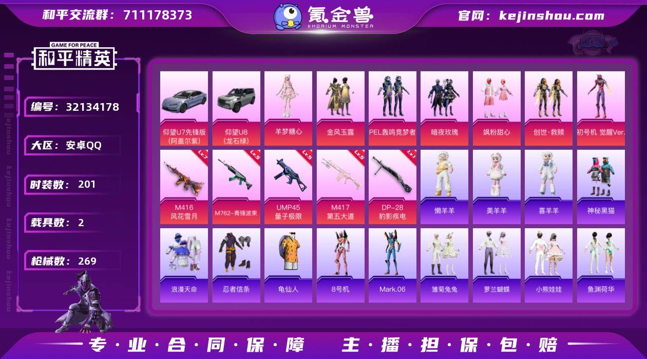【店主推荐捡漏号】安卓 手Q-7粉装-5特效枪-2载具-2粉色飞行器-84124热力值-11王牌印记-201套装-269枪皮【热门品类】:套装-浪漫天命,套装-忍者信条,套装-龟仙人,角色-8号机,角色-Mark.06【粉色套装】:粉装-金风玉露,粉装-PEL轰鸣竞梦者,粉装-暗夜玫瑰,粉装-飒粉甜心,套装-创世·救赎,角色-初号机 觉醒Ver.,角色-羊梦糖心【粉色枪皮等级】:M416-风花雪月(七级),M762-青锋波束(五级),UMP45-量子极限(五级),M417-第五大道(五级),DP-28-豹影疾电(一级)【粉色载具】:仰望U7(阿盖尔紫),仰望U8(龙石绿)【粉色枪皮】:M416-风花雪月,M762-青锋波束,UMP45-量子极限,M417-第五大道,DP-28-豹影疾电