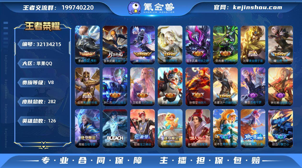 ·黑崎一护·黑崎一护天幕·神骥逐星野·逐花归海·灼幽烈阳·祈雪灵祝·炽阳神光·白虎志·武陵仙君·凤求凰·美猴王·飞衡·御风骁将·可二次】w18297-苹果Q-126英雄-282皮肤-7王者印记-300铭文-贵族积分8w【贵族8】【1典藏·1珍品·3星传说·19传说·1天幕·5按键】【因赛季更新游戏段付以上号为准!】 【英雄全皮】:孙权全皮,空空儿全皮 【荣耀典藏】:李白鸣剑曳影 【珍品传说】:宫本武藏黑崎一护 【天幕】:黑崎一护天幕 【传说皮肤】:马超神骥逐星野,桑启鸣野蒿,澜逐花归海,东皇太一灼幽烈阳,王昭君乞巧织情,公孙离祈雪灵祝,镜炽阳神光,虞姬启明星使,曜云鹰飞将,达摩黄金狮子座,百里玄策白虎志,梦奇胖达荣荣,后羿黄金射手座,诸葛亮武陵仙君,李白凤求凰,孙尚香末日机甲,宫本武藏地狱之眼,孙悟空地狱火,狄仁杰超时空战士 【限定皮肤】:白起狰,姜子牙天穹之誓,狄仁杰阴阳师,赵云皇家上将,赵云引擎之心,妲己时之彼端,嬴政白昼王子,鲁班七号狮舞东方,扁鹊奇幻香踪,芈月重明,吕布猎兽之王,吕布御风骁将,周瑜赤莲之焰,元歌云间偶戏,元歌无心,夏侯惇朔风刀,曹操烛龙,典韦穷奇,典韦蓝屏警告,马可波罗逐梦之星,马可波罗暗影游猎,狄仁杰魔术师,狄仁杰万华元夜,达摩星际陆战队,项羽海滩派对,老夫子醍醐杖,关羽冰锋战神,程咬金演武夺筹,韩信飞衡,兰陵王驯魔猎人,花木兰青春决赛季,花木兰默契交锋,亚瑟潮玩骑士王,孙悟空美猴王,孙悟空大圣娶亲,牛魔御旌,李元芳银河之约,虞姬启明星使,钟馗神迹守卫,钟馗驱傩正仪,女娲朔望之晖,雅典娜单词大作战,太乙真人饕餮,鬼谷子原初探秘者,诸葛亮武陵仙君,百里玄策白虎志,百里玄策原初追逐者,弈星混沌棋,公孙离蜜橘之夏,公孙离祈雪灵祝,沈梦溪星空之诺,明世隐疑决卦,裴擒虎李小龙,狂铁御狮,米莱狄御霄,米莱狄胡桃异想国,...