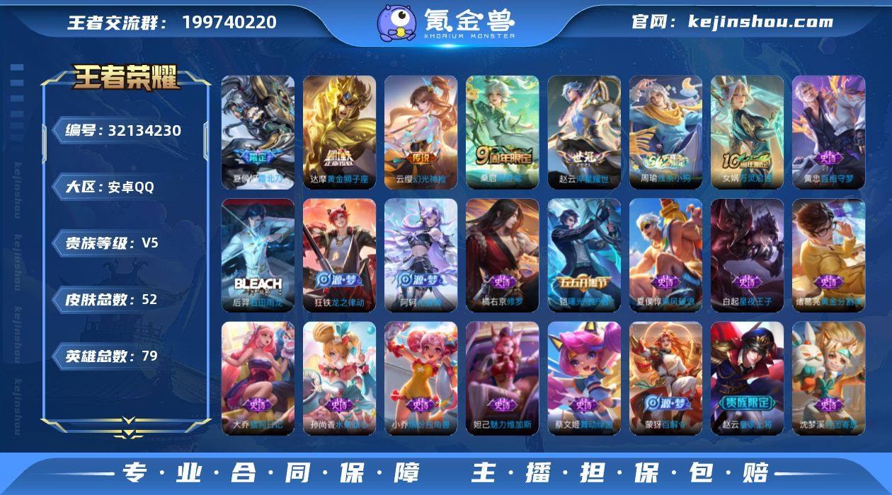 【精品推荐·霜北刀·淬星耀世·修罗·黄金狮子座】【可二次】YXw17777-安卓Q-77英雄-51皮肤-0王者印记-30铭文-贵族积分0w【贵族5】【5传说·1按键】【因赛季更新游戏段付以上号为准!】 【传说皮肤】:云缨幻光神枪,桑启鸣野蒿,夏侯惇霜北刀,赵云淬星耀世,达摩黄金狮子座 【限定皮肤】:夏侯惇霜北刀,杨戬破阵退雄兵,赵云皇家上将,项羽海滩派对,蒙犽百解令,周瑜熔金海岸 【赛季限定】:东皇太一噬灭天穹 【史诗皮肤】:女娲万灵启世,黄忠百相守梦,后羿石田雨龙,狂铁龙之律动,阿轲化蝶舞,蒙犽百解令,沈梦溪月团寄思,橘右京修罗,大乔猫狗日记,白起星夜王子,蔡文姬舞动绿茵,铠曙光守护者,诸葛亮黄金分割率,小乔缤纷独角兽,夏侯惇乘风破浪,妲己魅力维加斯,孙尚香水果甜心,赵云皇家上将 【其他皮肤】:艾琳鹤鸣心笺,张良罗小黑战记,鬼谷子克喵,莱西奥踏浪烽翎,庄周锦麟游梦,白起死霸装,露娜命运加冕,张良灵野札记,达摩爆裂喵拳,姜子牙星梦巡礼,西施雪境奇遇,吕布逐霄战戟,东皇太一噬灭天穹,周瑜熔金海岸,杨戬破阵退雄兵,蒙恬蔚蓝守将,刘备纽约教父,甄姬花好人间,达摩拳王,亚瑟死亡骑士,典韦黄金武士,孙膑天使之翼,项羽海滩派对,明世隐占星师,女娲尼罗河女神,杨戬埃及法老,雅典娜战争女神,露娜绯红之刃