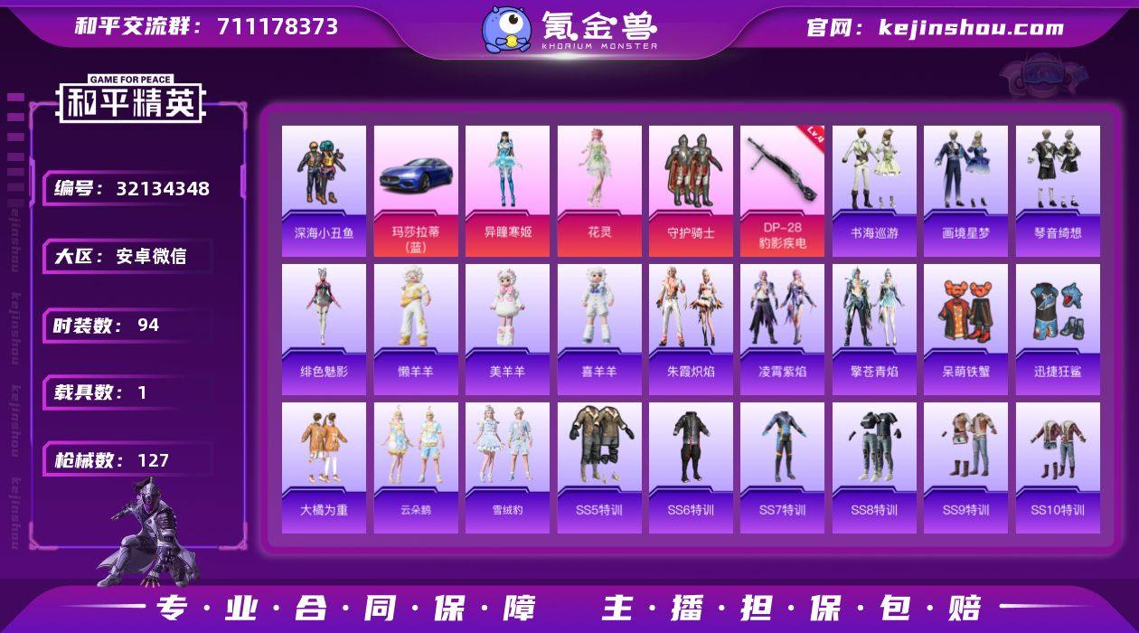YZJ13668 无二次 安卓V-1载具3粉装2特效枪9热门 极品小号 双字ID(浮廾) (593点卷)花灵 深海小丑鱼 大局为重 黑色刀锋 鲨鱼裤 螃蟹头 老6服 94套装127枪皮 35747热力值 3印记 历史超级王牌1星 【1载具】 玛莎拉蒂蓝色 【3粉装】 花灵 异瞳寒姬 守护骑士 【2特效枪】 AKS-74U-森灵之息 (5级) DP-28-豹影疾电 (4级) 【9热门】 雪山精英 呆萌铁蟹 迅捷狂鲨 深海小丑鱼 大橘为重 破蛋小黄鸡 风华少年志 黑色刀锋 M416-仓鼠灰灰 【3头盔】 银河战甲头盔 金风玉露头盔 深海小丑鱼头盔 【3背包】 银河战甲背包 折纸暴龙背包 深海小丑鱼背包 营地ID:708387954