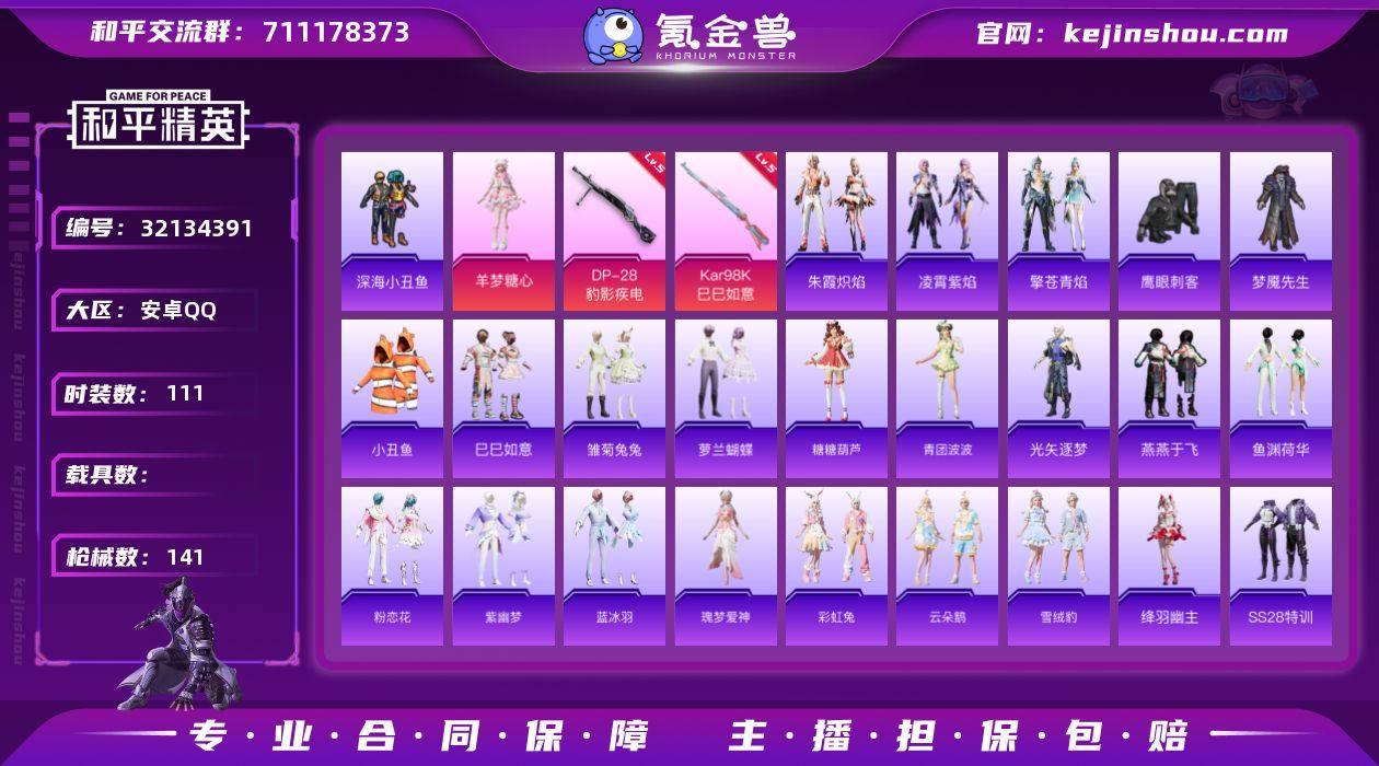 【特价出售/店主推荐】 安卓 手Q-1粉装-4特效枪-0载具-1粉色飞行器-34369热力值-8王牌印记-111套装-141枪皮【热门品类】:套装-深海小丑鱼,套装-小丑鱼【粉色套装】:角色-羊梦糖心【粉色枪皮等级】:UMP45-萌骑冒险(三级),Kar98K-巳巳如意(五级),Mk14-福马献瑞(五级),DP-28-豹影疾电(五级)【粉色枪皮】:UMP45-萌骑冒险,Kar98K-巳巳如意,Mk14-福马献瑞,DP-28-豹影疾电